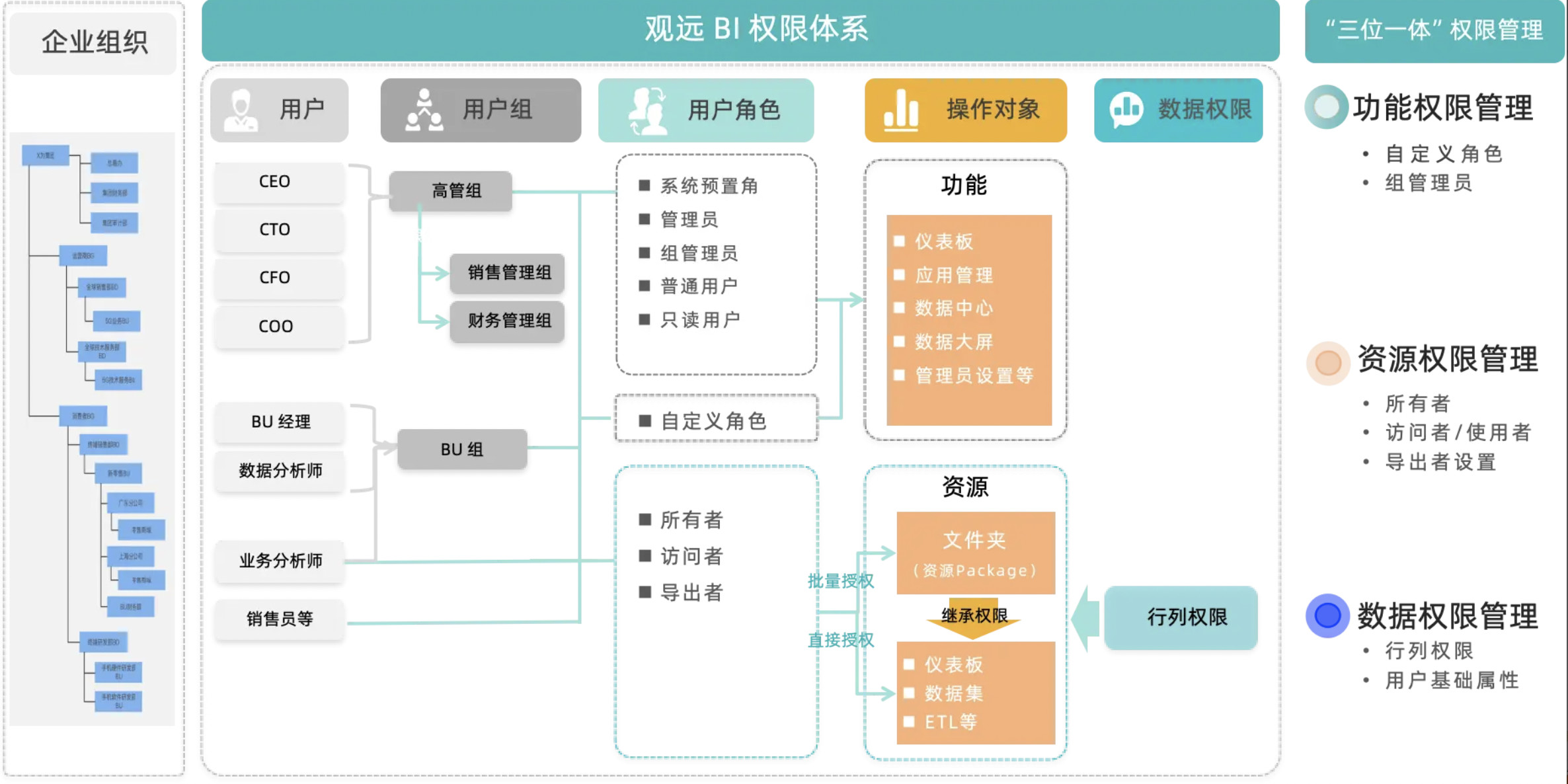 观远BI支持基于角色的访问控制(RBAC),支持三种系统预置角色(管理员、普通用户、只读用户)和用户自定义角色。支持基于用户账号、用户组等载体实现对仪表板、数据集、文件夹等各类资源细粒度的数据访问控制,也支持基于各类角色的功能权限管控。