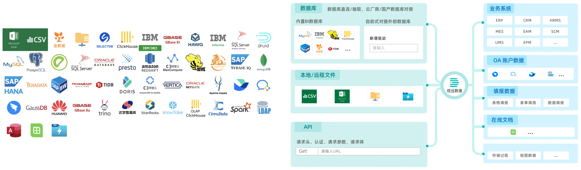 支持对接包含数据库、文件、Web Service、第三方(飞书表格、飞书文档)、观远填报能力在内的40+种数据源,另支持自定义驱动适配各种数据库连接,为后续数据分析提供基础保障。