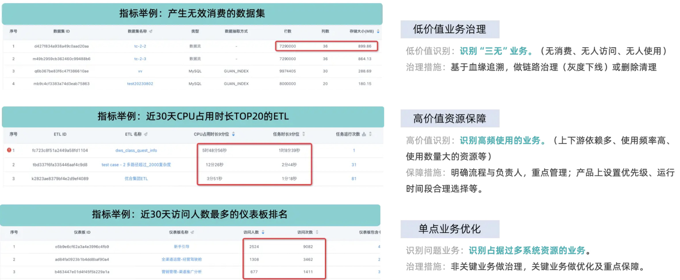- 业务治理解读:主要分为机器资源用量盘点和数据资产管理盘点,分别对数据集、ETL、仪表板、卡片消耗的系统资源与产生的业务价值提供了盘点思路和行动优化建议。