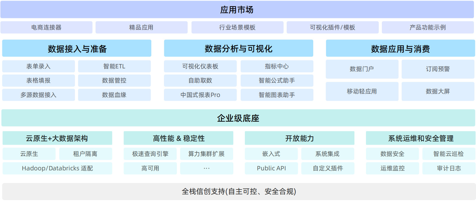 观远 BI 基于云原生体系,深度集成 Hadoop、Databricks 大数据架构。支持万级用户数、十亿级数据量的企业规模化业务需求,保障业务用起来。云原生+大数据的融合让 BI 适配企业业务、低成本的无限扩展,避免2年重构或3年迁移的窘境。