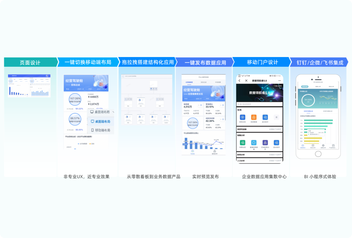 通过零代码拖拉拽的方式将多个仪表板移动端集成在一个轻应用,同时,提供移动端门户页面将多个轻应用集成在一个页面中,从而实现千人千面的移动端原生APP的看数体验,用户可随时随地掌握业务经营数据,实现数据支撑决策。
