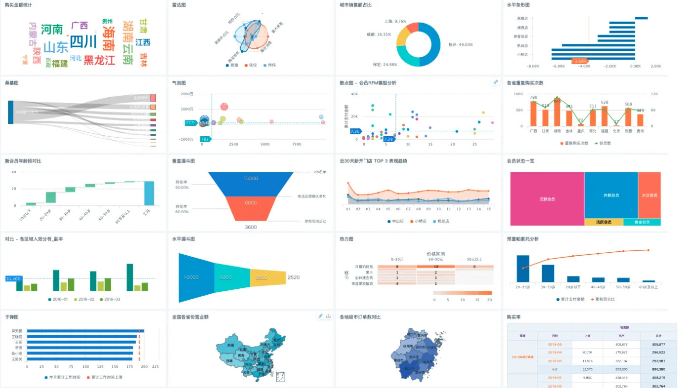 提供50+种图表类型及交互式设计能力,支持拖拽式构建动态数据看板,实现多维度、实时数据的直观呈现,助力用户快速发现业务洞察并支持决策。