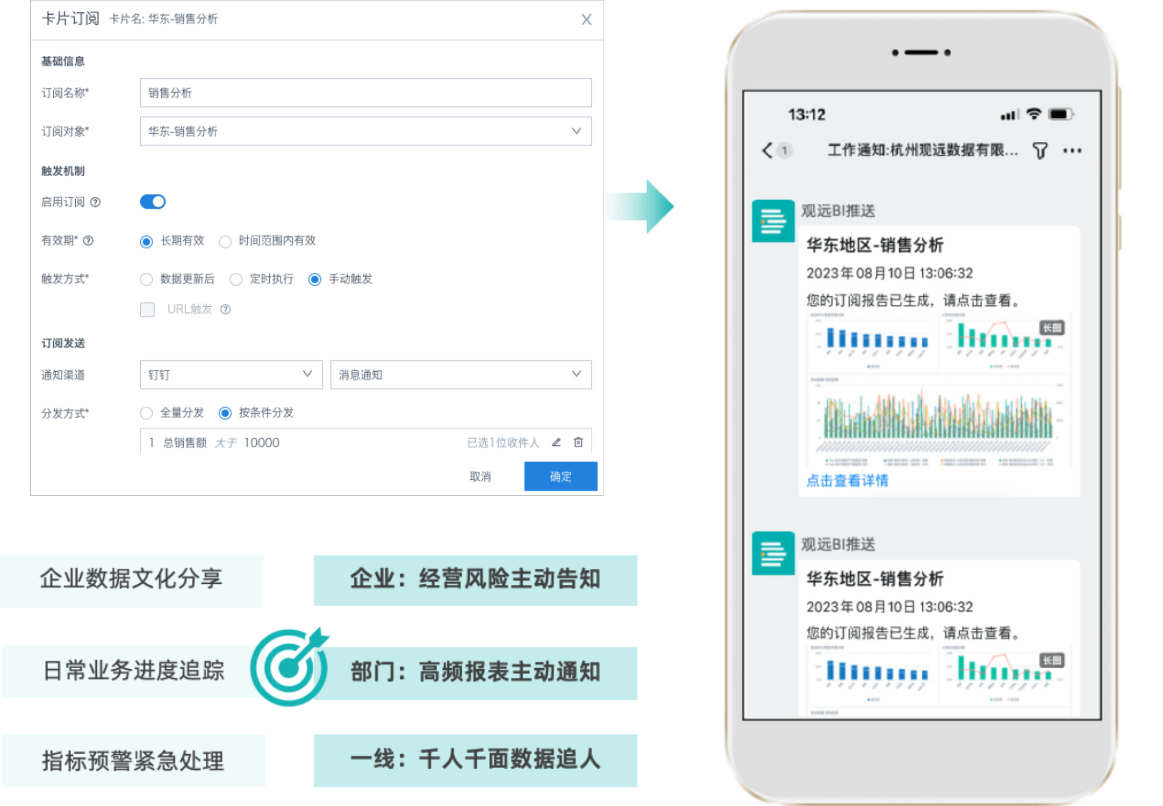 基于数据集、仪表板、仪表板页面等,通过邮件、钉钉、企业微信、飞书等渠道,自动推送带图片、动态参数的订阅消息或满足异常条件的预警消息,确保关键数据变化及时触达相关人员。