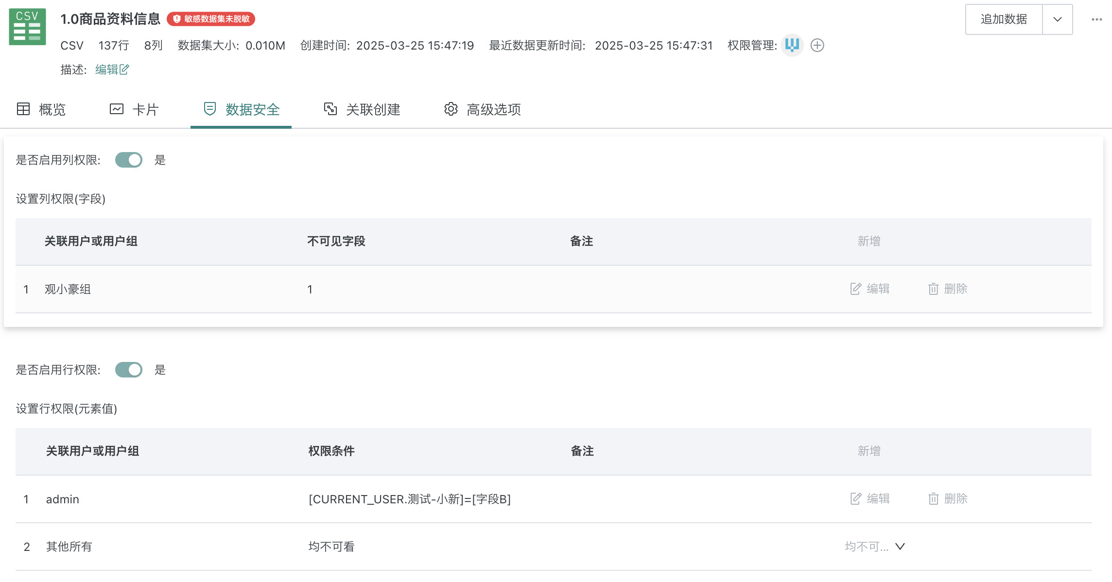提供细粒度的行级与列级数据权限控制,支持基于用户或用户组灵活配置数据可见范围。通过权限模板实现快速授权与管理,确保不同角色用户在同一数据集中仅能访问授权内容,有效防范越权操作,夯实企业数据安全基础。