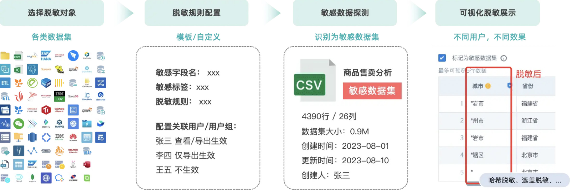 提供字段级动态数据脱敏能力,支持对数据集中敏感信息的自动探测、识别与脱敏规则配置。确保在可视化查询与分析过程中,敏感数据按规则进行掩码或替换展示,从源头保障数据隐私与安全合规,避免敏感信息泄露风险。