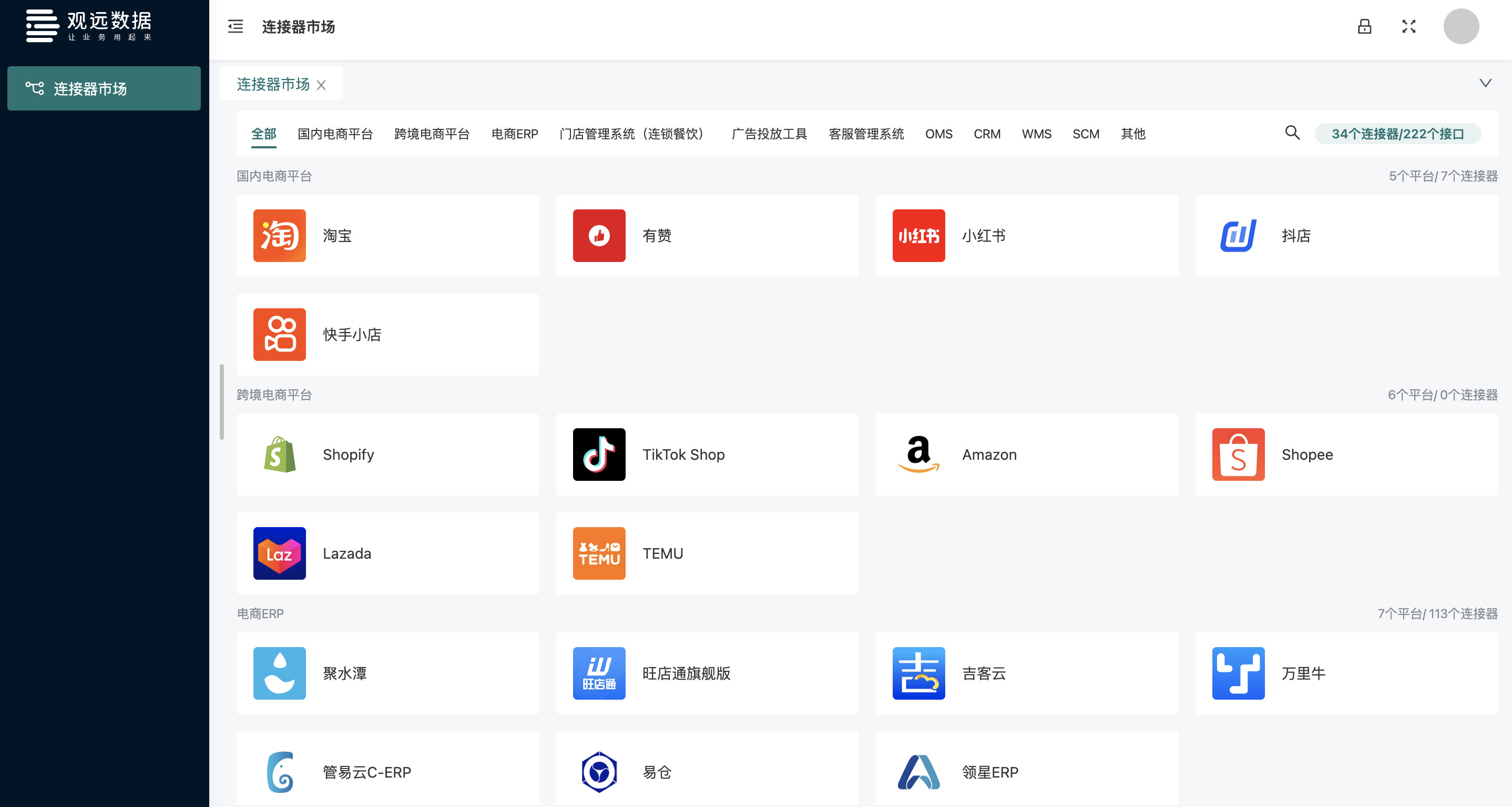 通过标准化 API 接口方式获取淘宝、抖音、小红书、TikTok、旺店通、聚水潭、领星平台数据,帮助商家高效获取精准的全域数据,消除多系统数据孤岛,为业务决策提供可靠的数据基础。