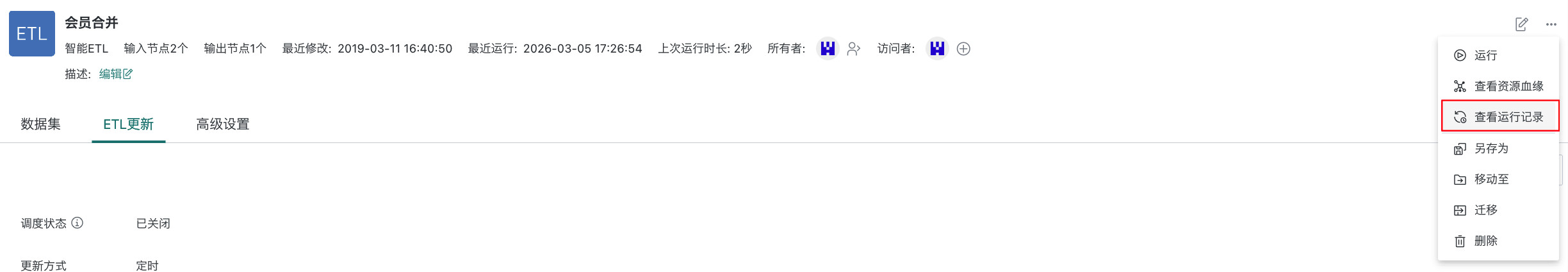 | 查看运行记录 | 查看 ETL 任务的执行记录,包括 ETL 任务开始执行时间、完成时间、运行时长及状态等信息,用于监控任务的执行情况和排查问题。 |