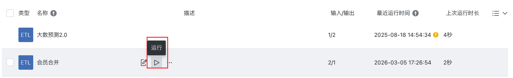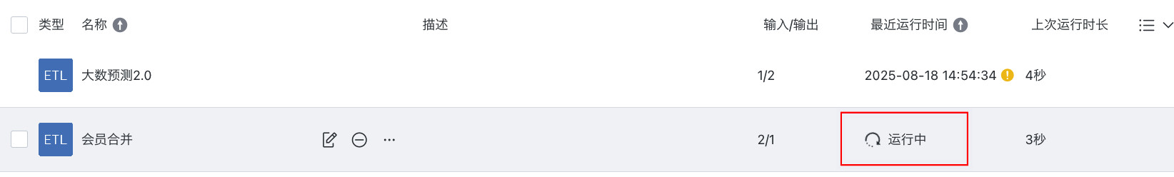 | 运行 | 手动启动或触发已创建的 ETL 任务,使其执行数据处理流程,通常用于验证任务配置和获取实时处理结果。 |