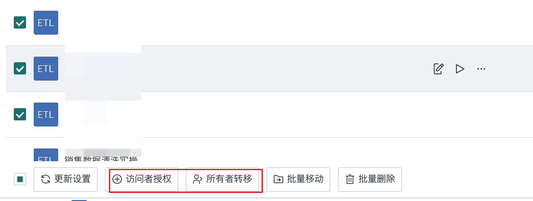 支持在 ETL 列表对多个 Smart ETL 任务批量操作,包括更新设置、权限配置(所有者转移、访问者授权)、移动或删除。这样将节省重复操作的时间,提高工作效率。