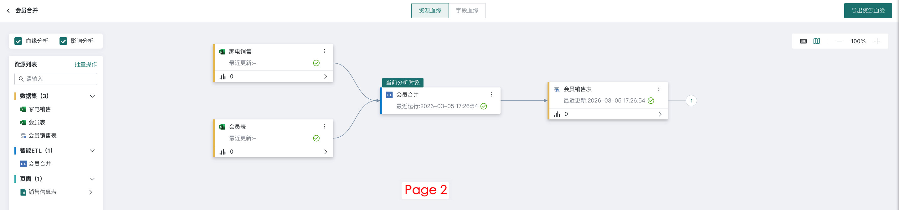 查看 ETL 任务执行所涉及的数据资源之间的关系,透过资源血缘,可以方便的看到每一个数据应用、分析看板、ETL、数据集等之间的关联,数据分析的流程走向尽在掌握,从而实现快速数据治理等工作,了解资源上下游依赖情况、资源删改风险评估等,在排查问题时,也可快速定位问题所在。具体详见 资源血缘