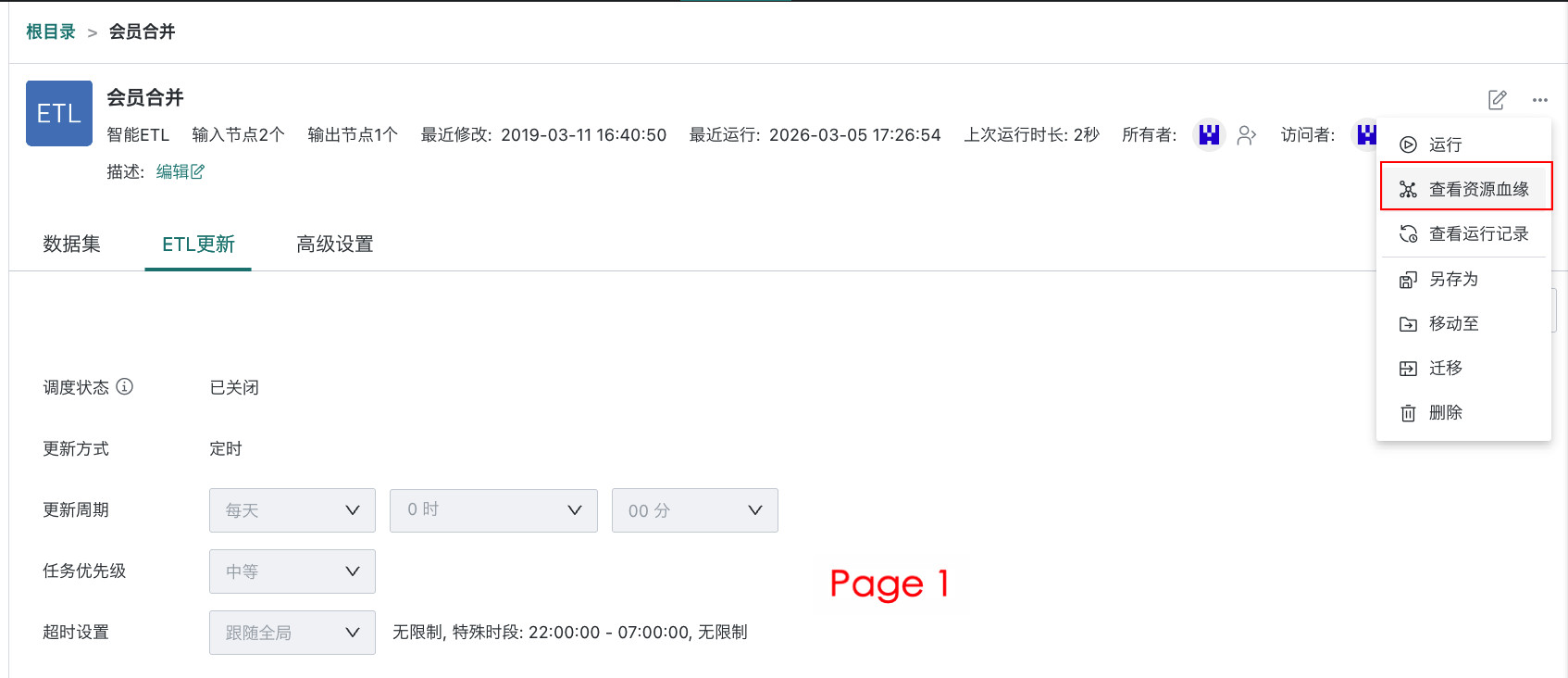 | 查看资源血缘 | 查看 ETL 任务执行所涉及的数据资源之间的关系,透过资源血缘,可以方便的看到每一个数据应用、分析看板、ETL、数据集等之间的关联。 |
