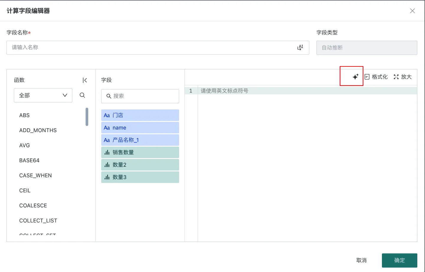 说明观远目前支持智能编码,可点击右侧「智能编码」 AI 小图标,通过 AI 自动生成符合内容的 SQL,如何使用详见 AI 助手。