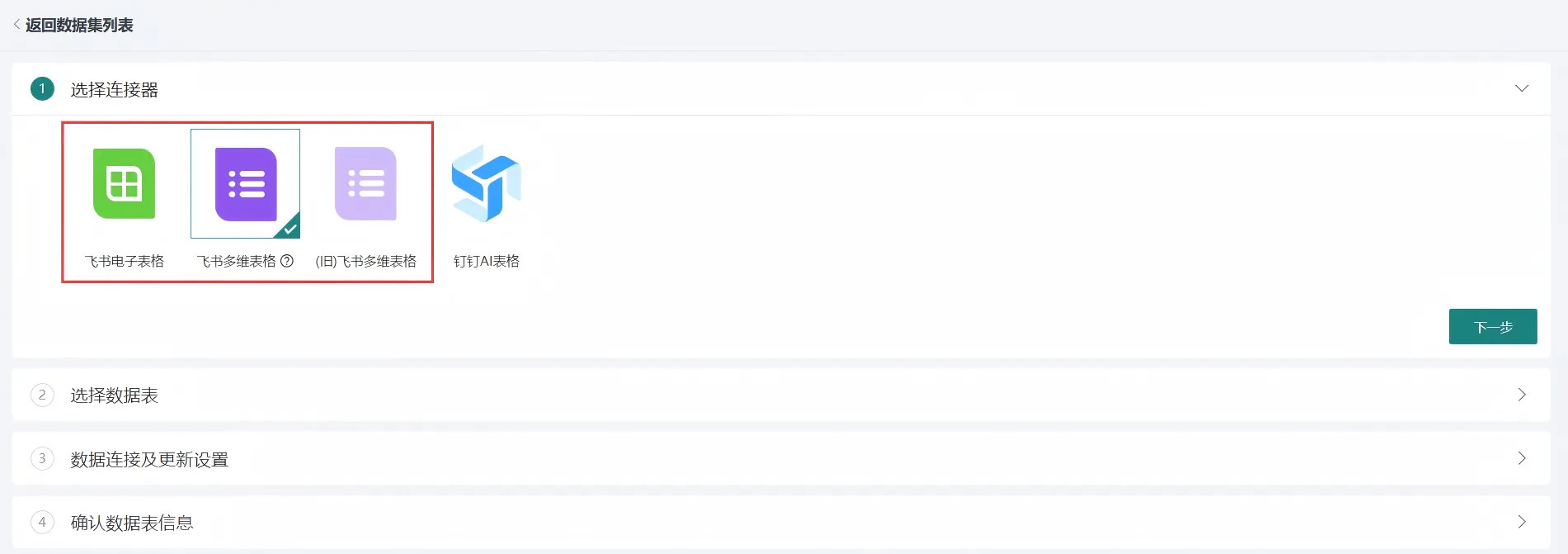- 新接口连接器(建议优先选择):7.1 及以上版本支持对接飞书多维表格新接口,目前仅支持数据表及收集表两种类型的接入。为保障数据连接查询服务稳定,建议在新建数据集时优先选择此连接器。