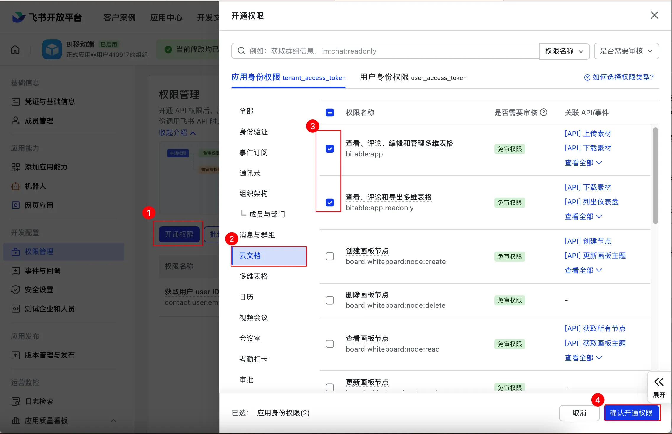 登录 「飞书开发者后台」,进入飞书应用的「开发配置 > 权限管理」界面,为飞书云文档开启相关接口权限。
