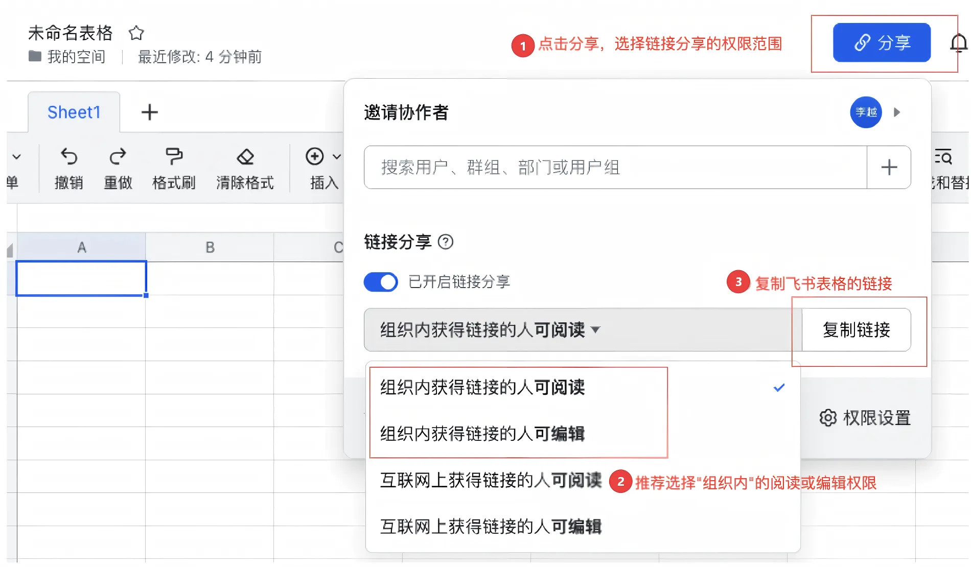 - 互联网上获得链接的人可编辑(公开可见,可能存在数据泄露且被篡改的合规风险,请谨慎选择)。