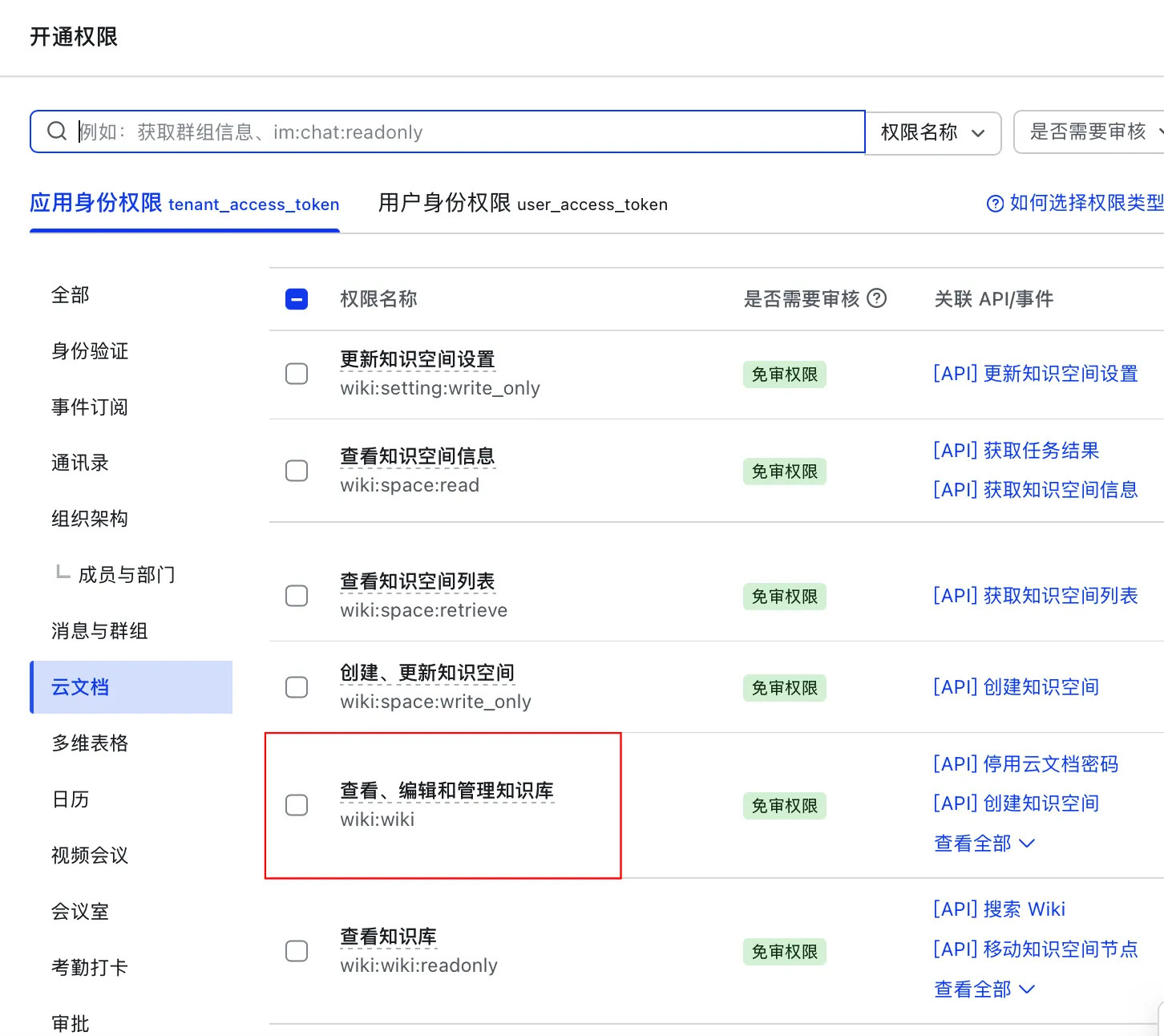 如果文档存为知识库下(文档链接为「域名/wiki/...」),则需再开通 wiki 权限,详见: