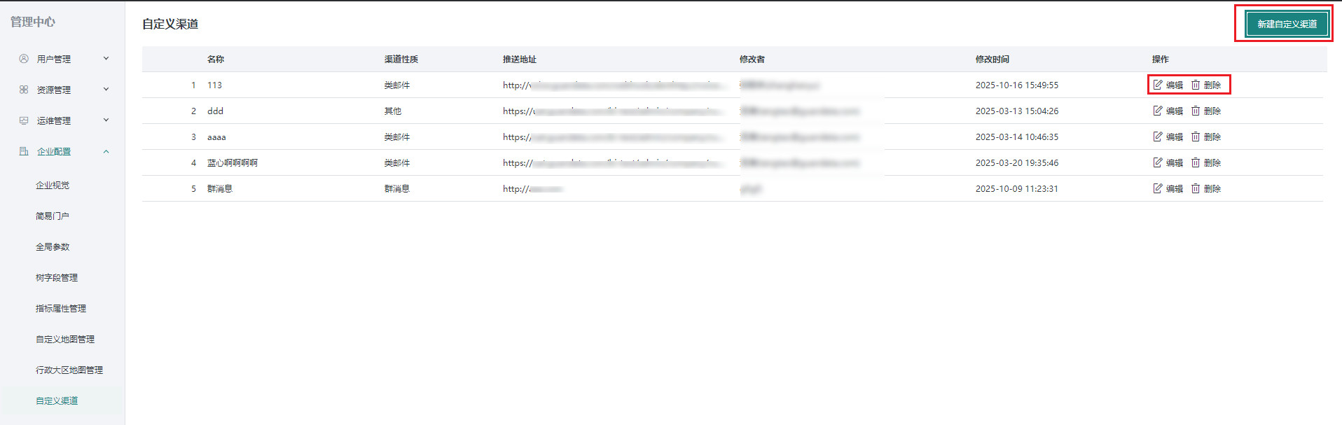 1. 进入「管理中心 > 企业配置 > 自定义渠道」,可以看到公司域中存在的自定义渠道列表。