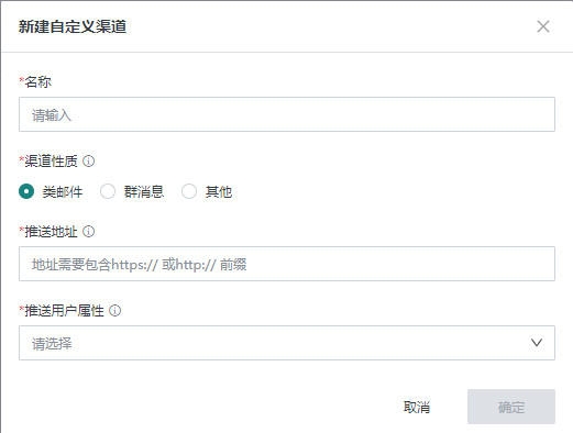 4. 每个渠道必须包含名称、渠道性质、推送地址、推送用户属性。 其中,渠道性质包括类邮件、群消息、其他。