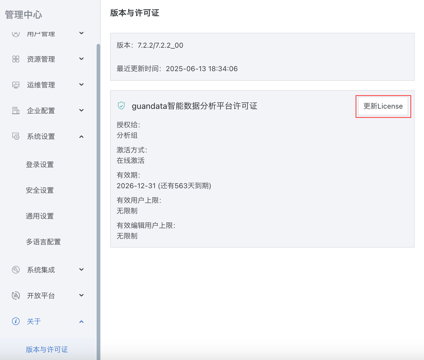 进入BI 平台「管理中心 > 关于 > 版本与许可证」页面,点击「更新License」,上传许可证文件完成激活。