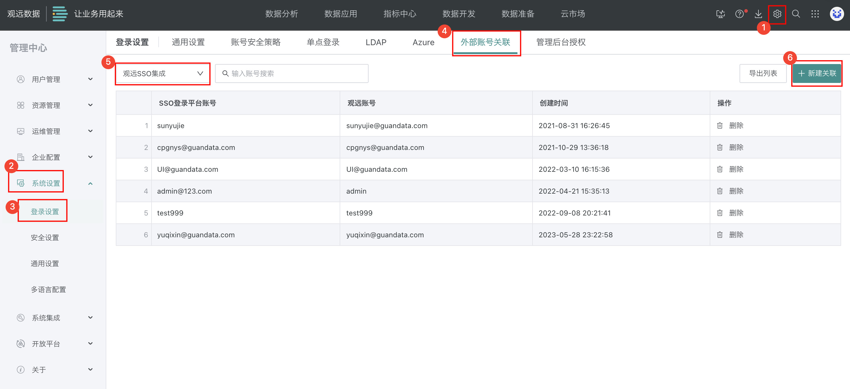 在「管理中心>系统设置>登录设置>外部账号关联」页面,左侧选择「观远SSO集成」,点击「新建关联」,