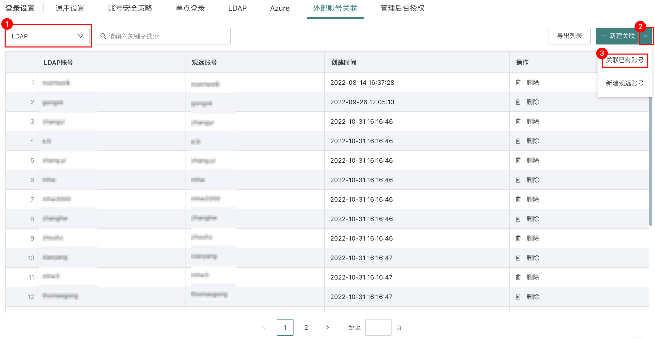 在「管理中心 > 系统设置 > 登录设置 > 外部账号关联」页面,左侧选择「LDAP」,点击右上方「下拉按钮 > 关联已有账号」,将下载的 Excel 文件上传。