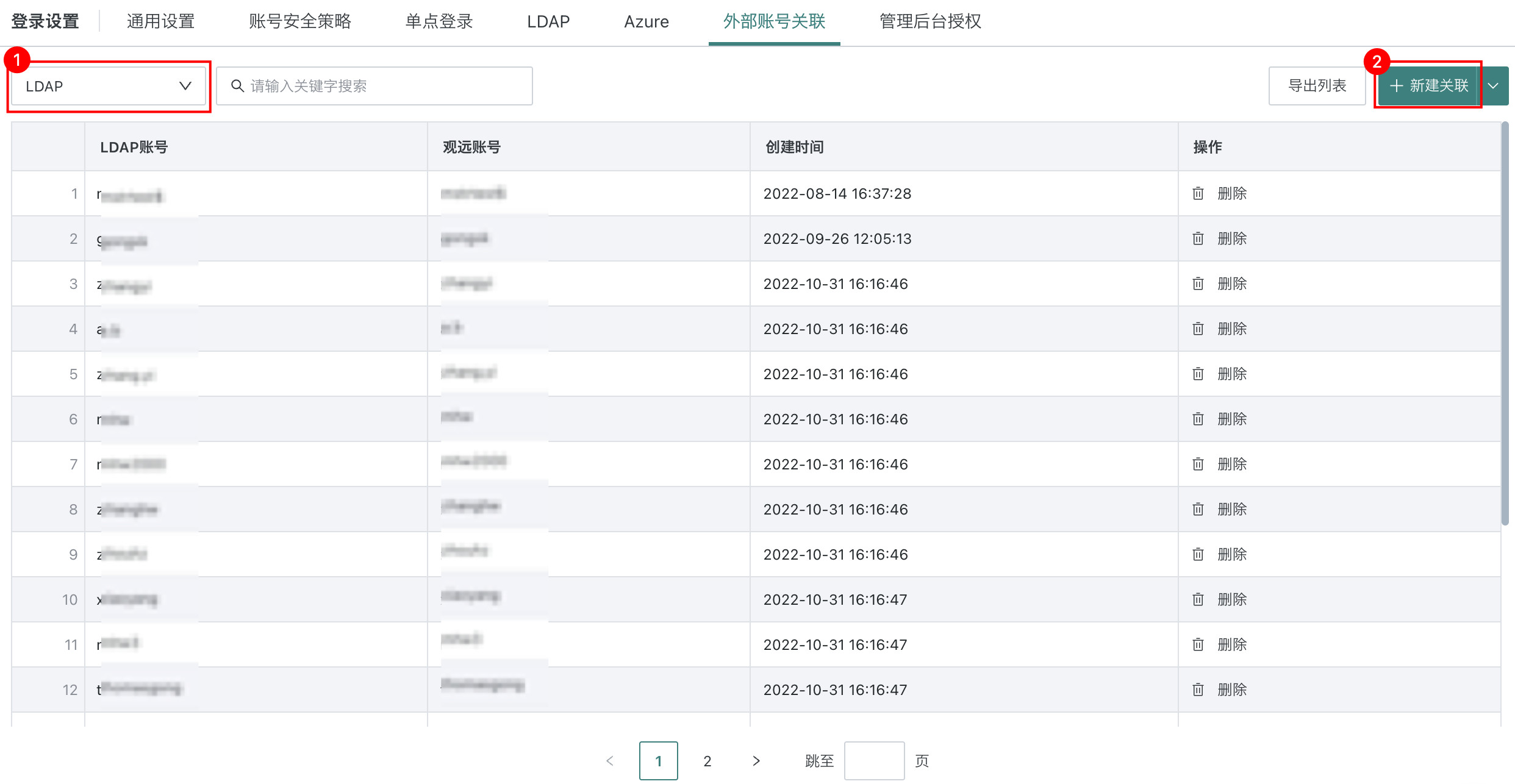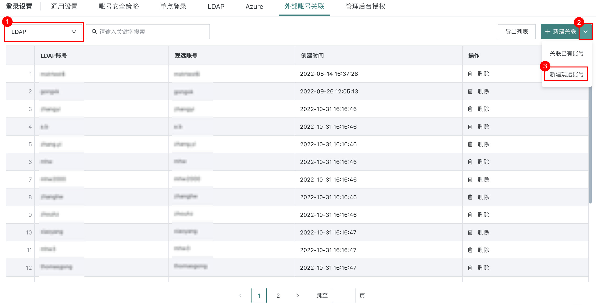 在「管理中心 > 系统设置 > 登录设置 > 外部账号关联」页面,左侧选择「LDAP」,点击右上方「新建关联」按钮,选择对应的账号与角色类型,即可完成新用户创建与关联。
