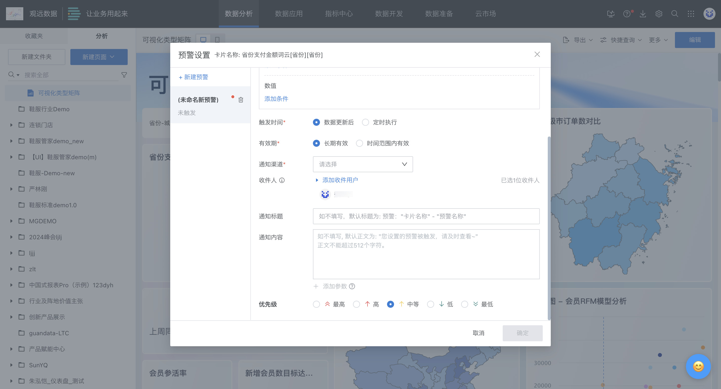 消息通知:可添加观远BI平台中的用户或用户组作为收件人,预警消息会单独发送至个人。