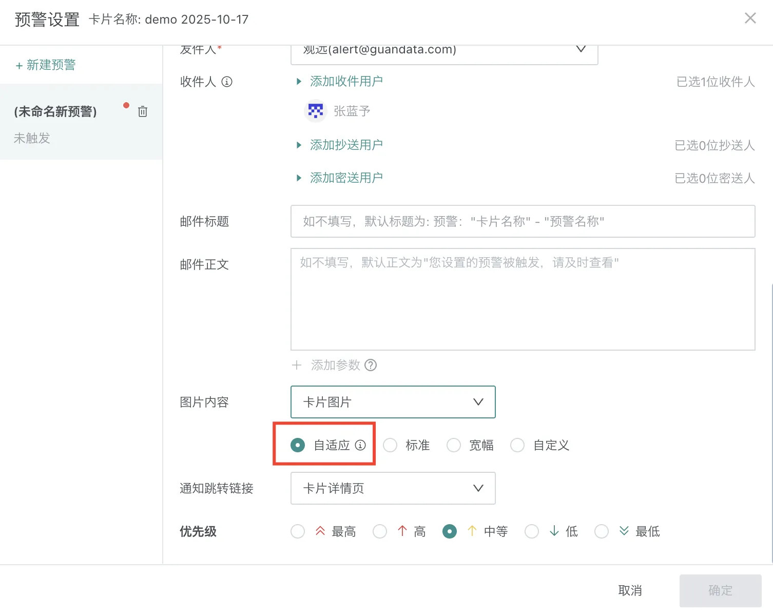 9)图片内容:支持插入卡片图片。其中,若卡片类型为中国式报表pro、可视化图表/指标卡片-表格分类,新增「自适应」选项,图片将会按数据量自适应宽高后截图发送。