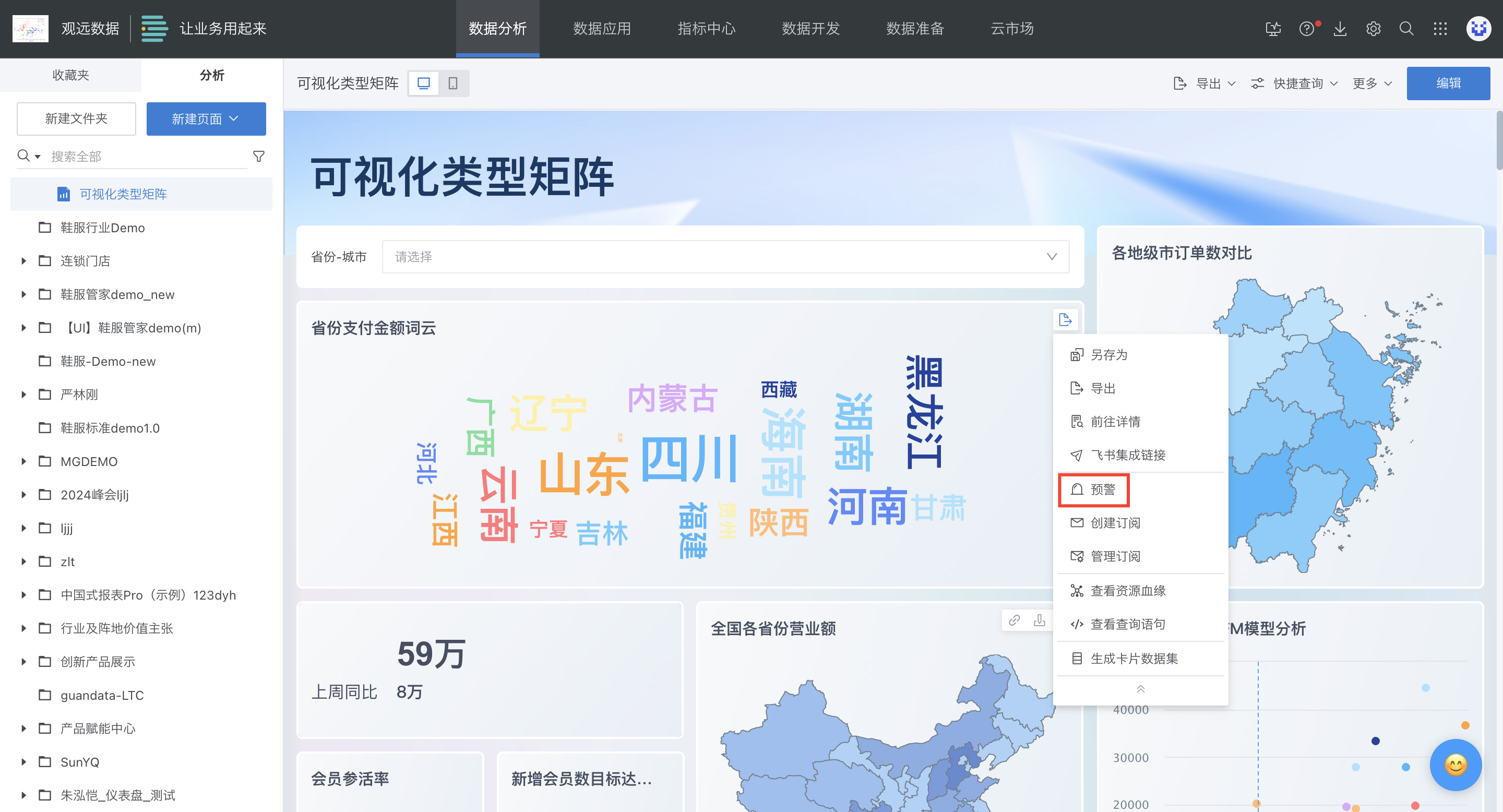 预警,是当卡片内维度或数值达到某一设定的条件时,平台第一时间告知用户数据异常的信号。该功能可以帮助用户及时做出决策、反馈。资源的所有者可设置预警,预警的接收方式可以为邮件、企业微信、钉钉、飞书、泛微OA、云之家等消息推送。预警支持周期执行或数据更新后执行。