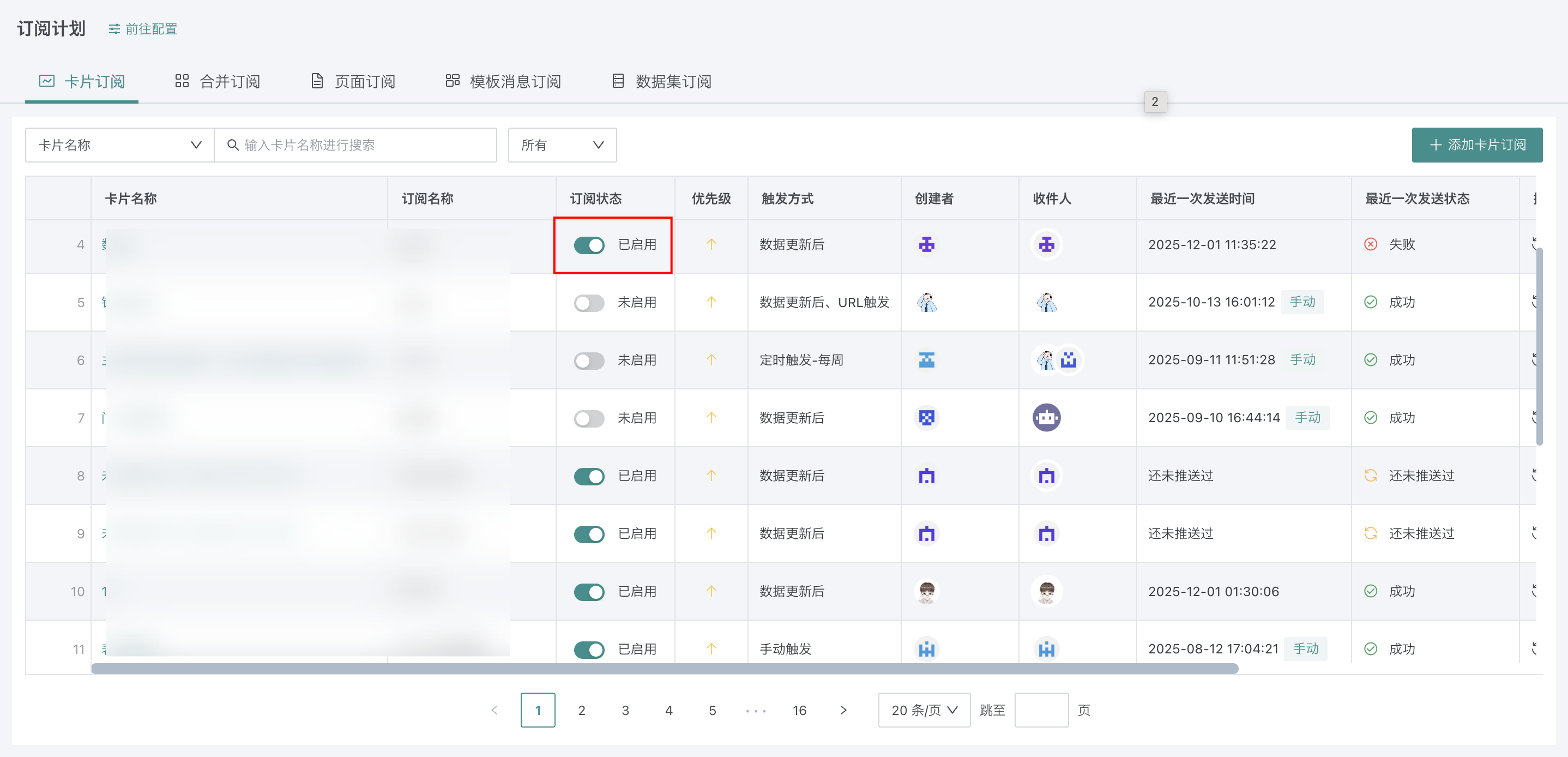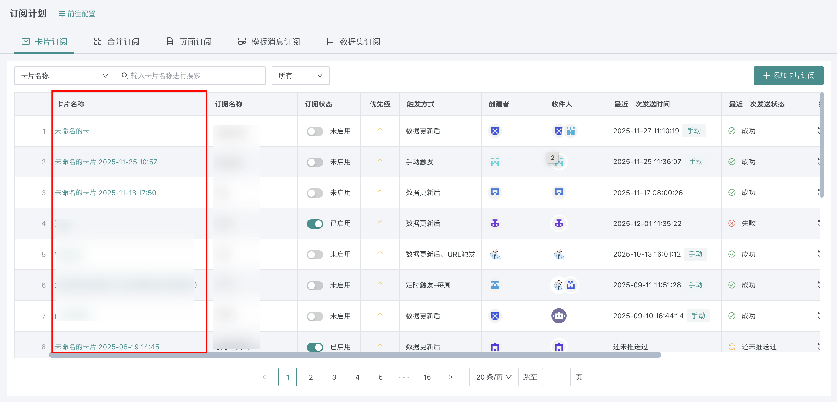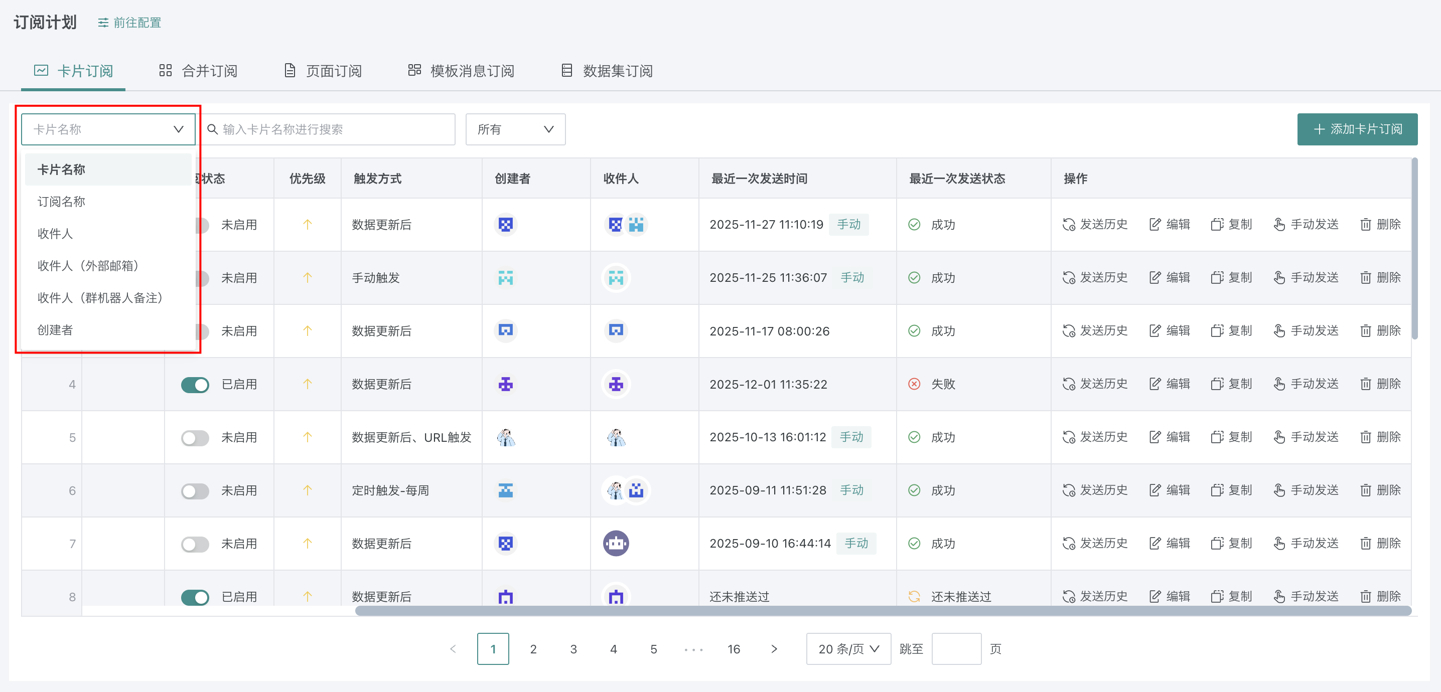 搜索订阅:在搜索栏中,支持按照卡片名称、订阅名称、收件人、创建者进行关键词搜索。