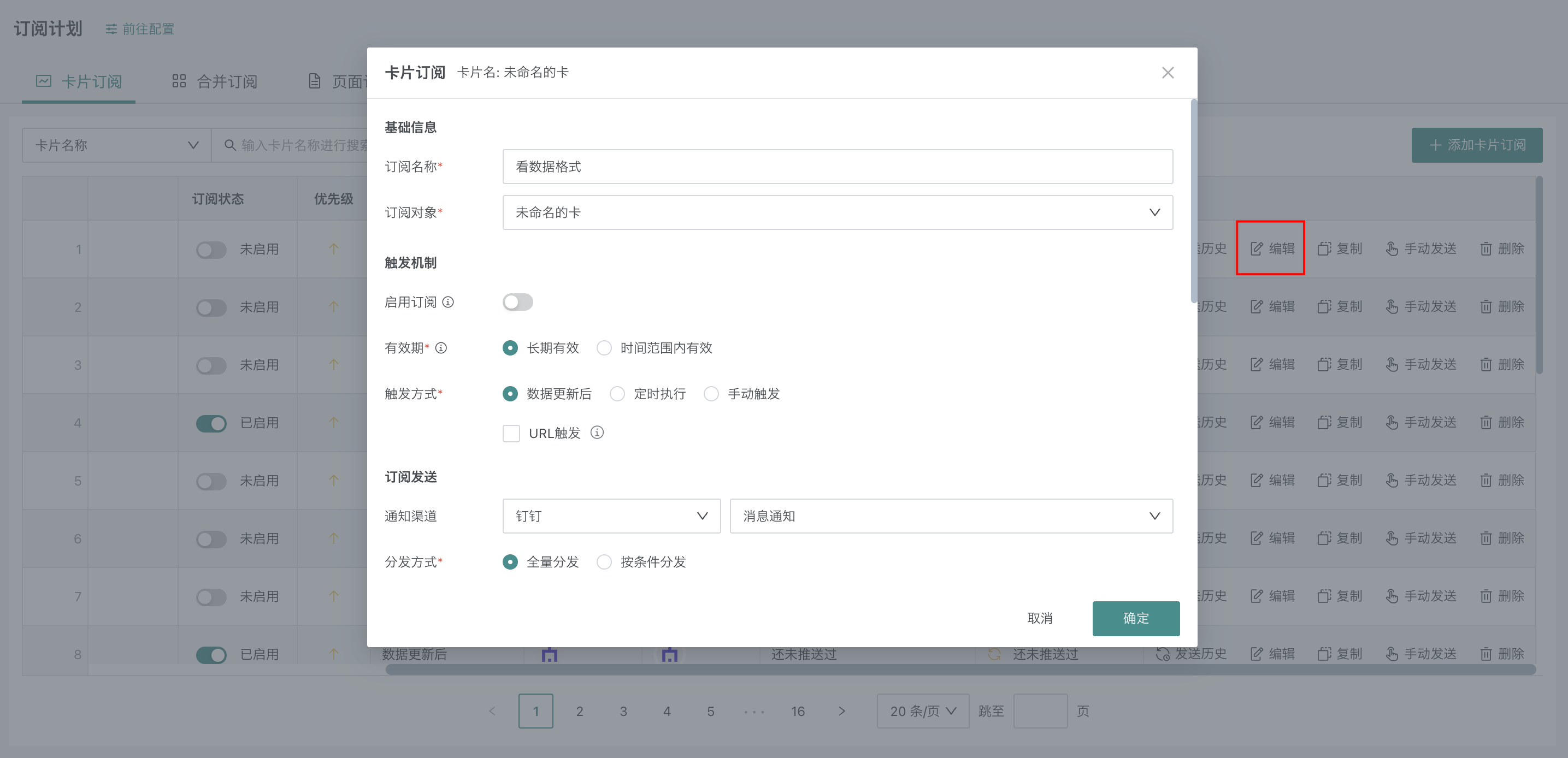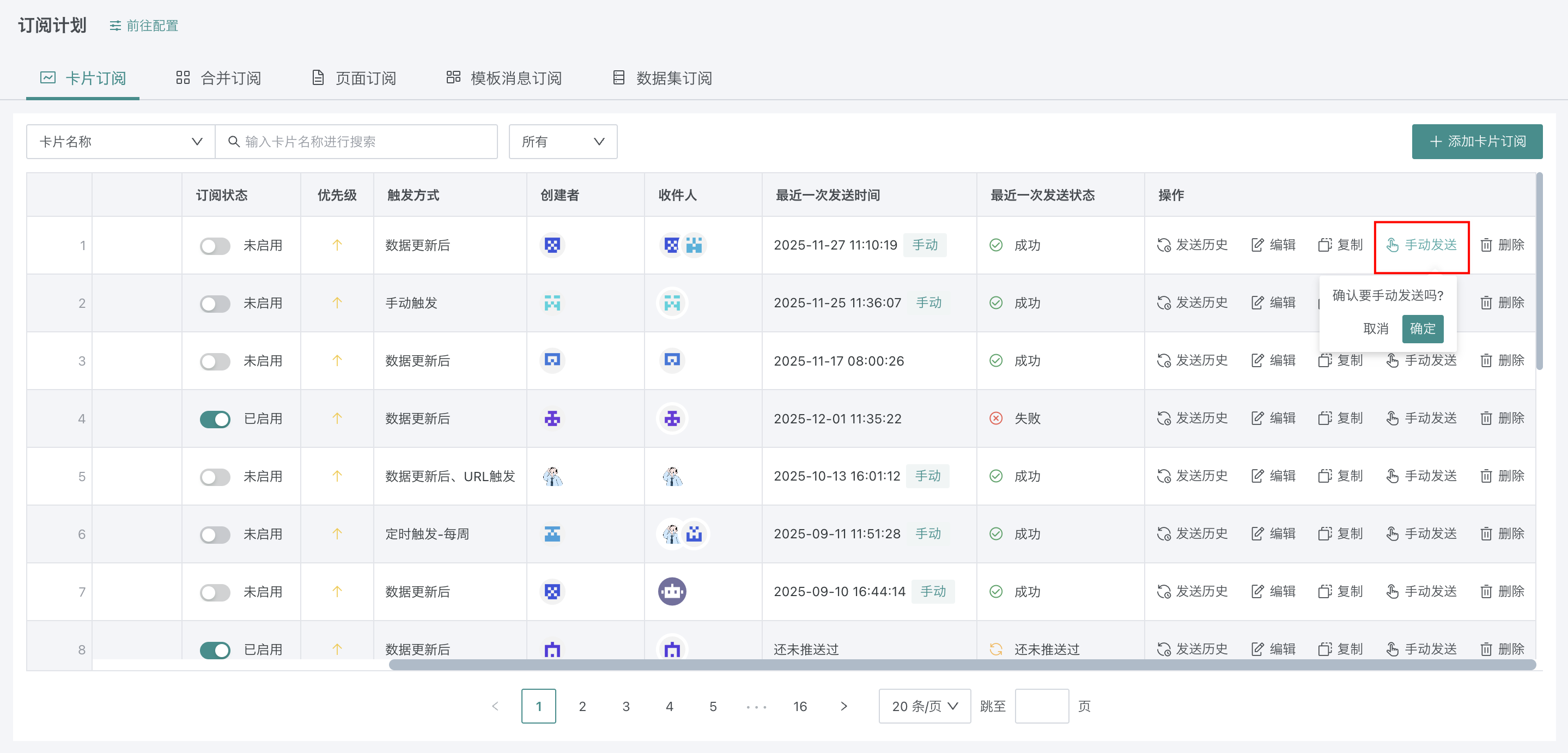 在「订阅计划」中,可对卡片订阅、合并订阅、页面订阅、数据集订阅进行管理设置。具体设置内容如下: