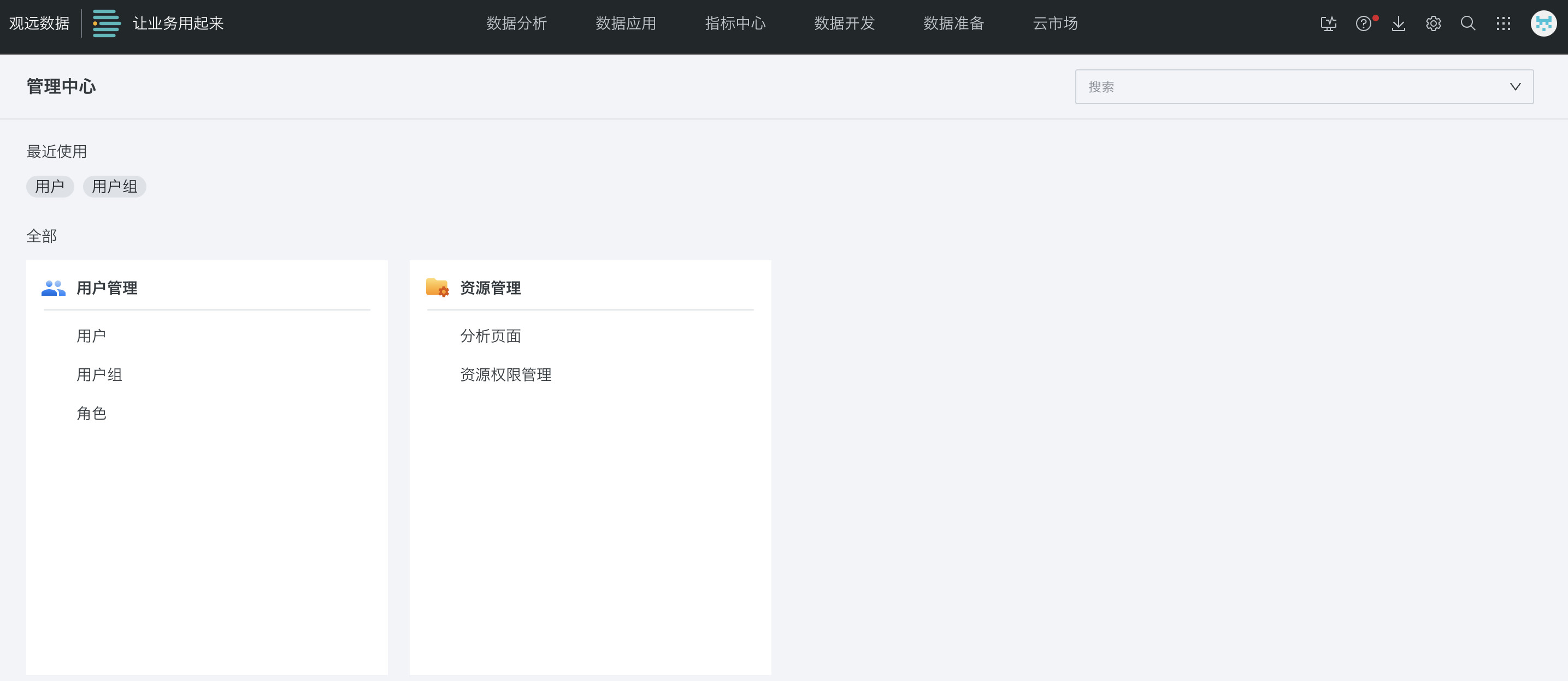 使用组管理员账号登录后,在管理中心可看到如下功能页面。