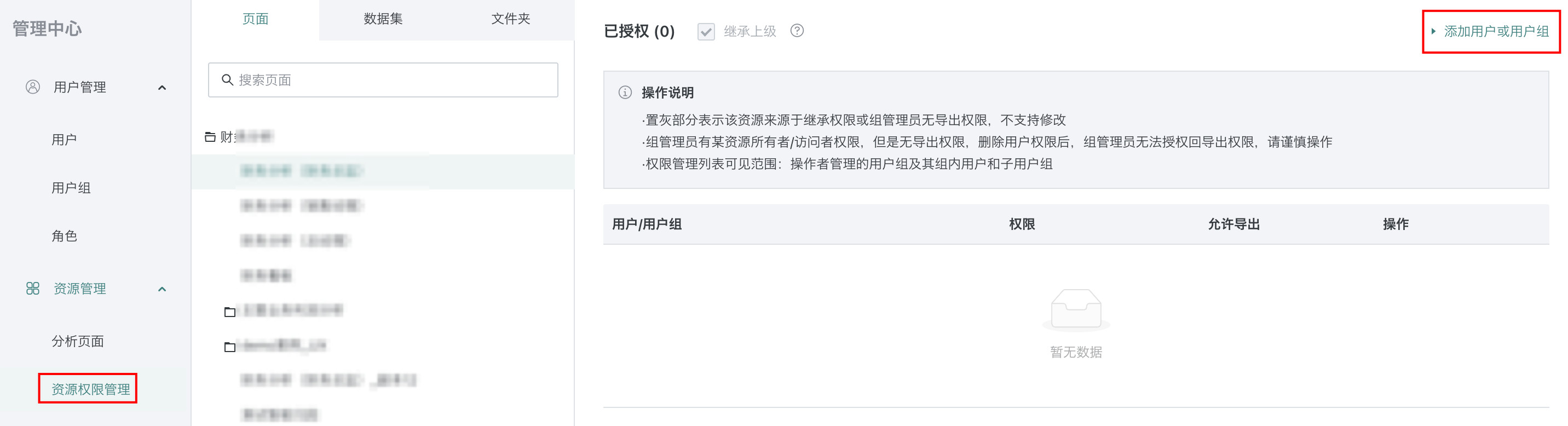 配置用户权限。组管理员可对有权限的资源进行编辑操作,并且可以对组内成员进行仪表板、数据集、文件夹的批量授权。