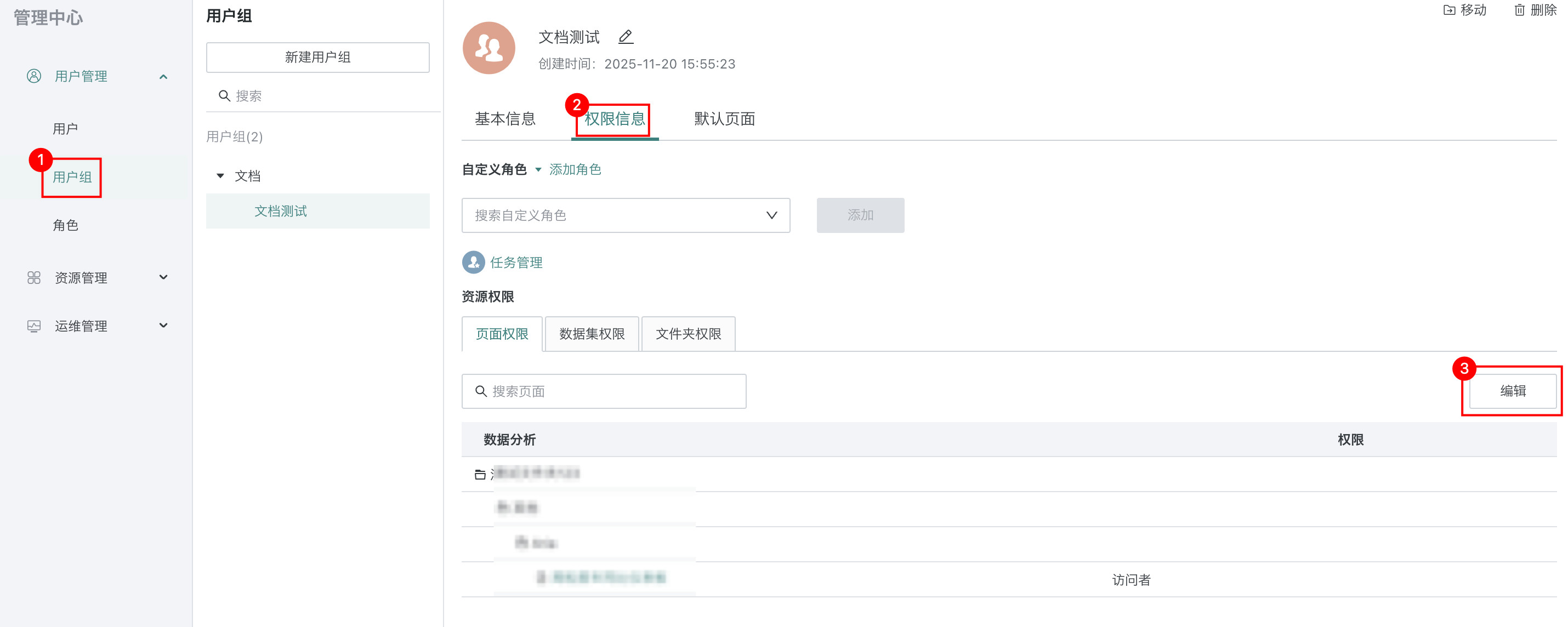 当组管理员是访问者时,可以查看页面信息和资源权限,但不可修改。点击「资源权限」跳转到资源权限管理页面。