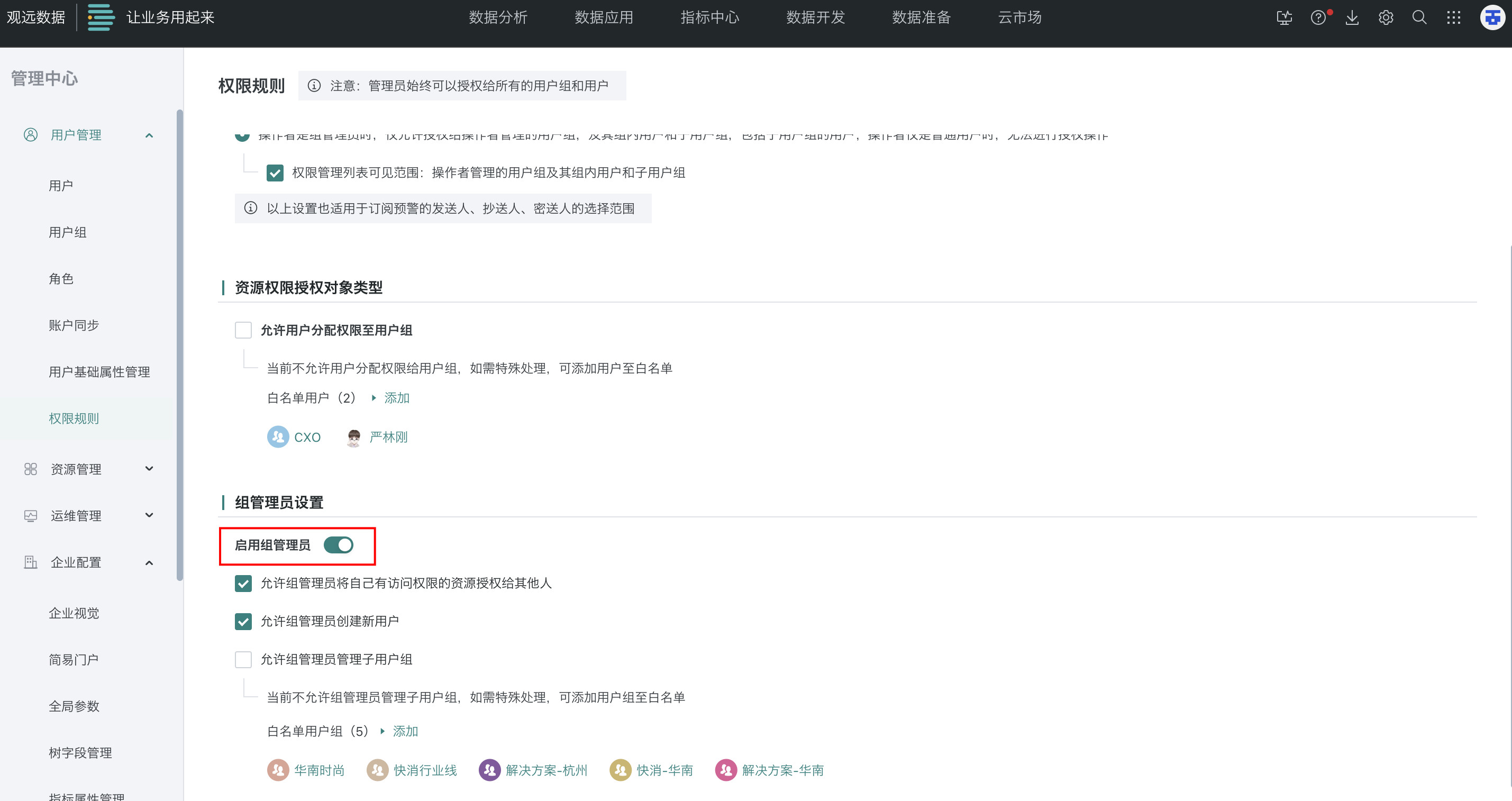 作为管理员,您可通过在「管理中心 > 用户管理 > 权限规则 」页面,开启组管理员按钮。