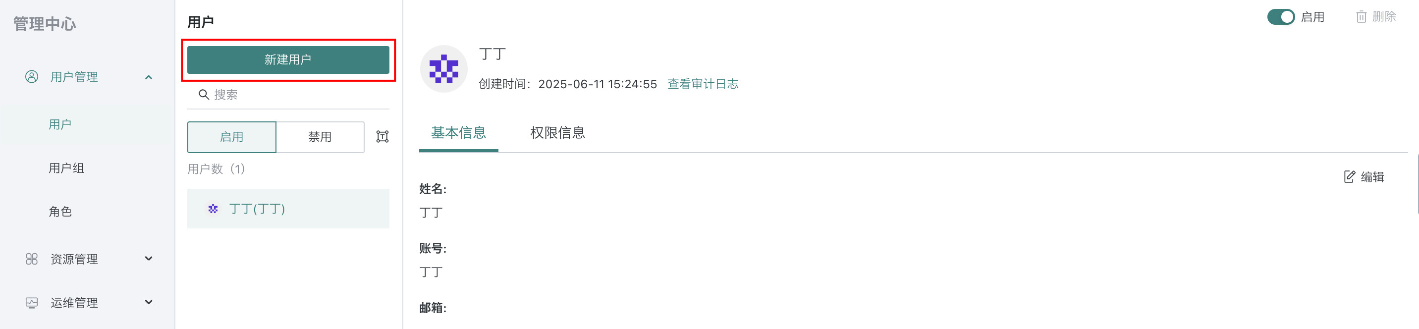 在「管理中心 > 用户管理 > 用户」页面,点击「新建用户」。