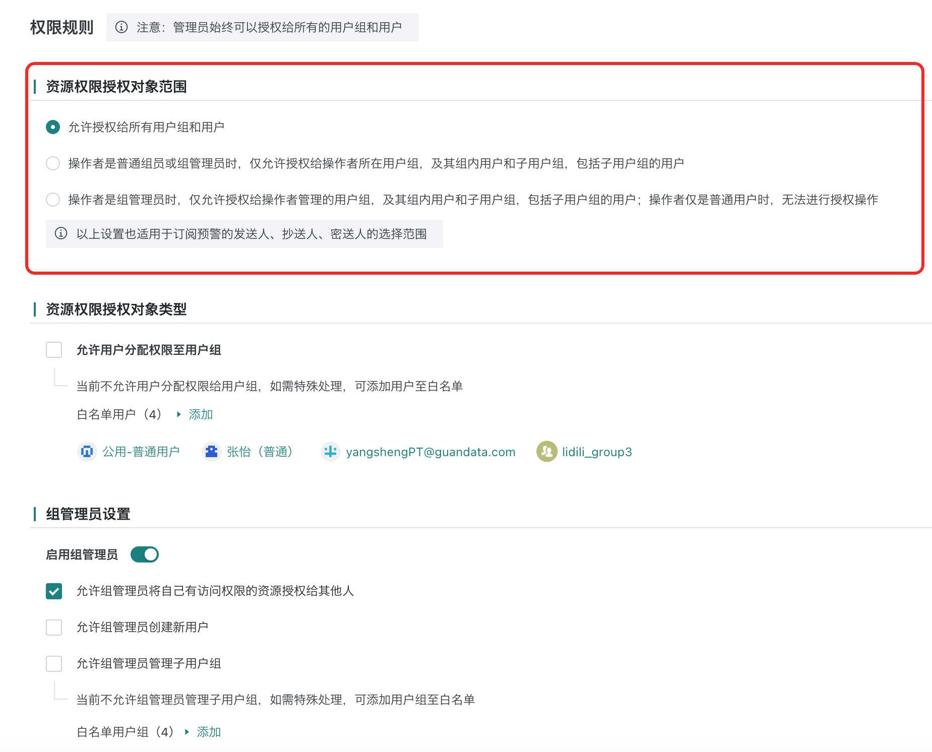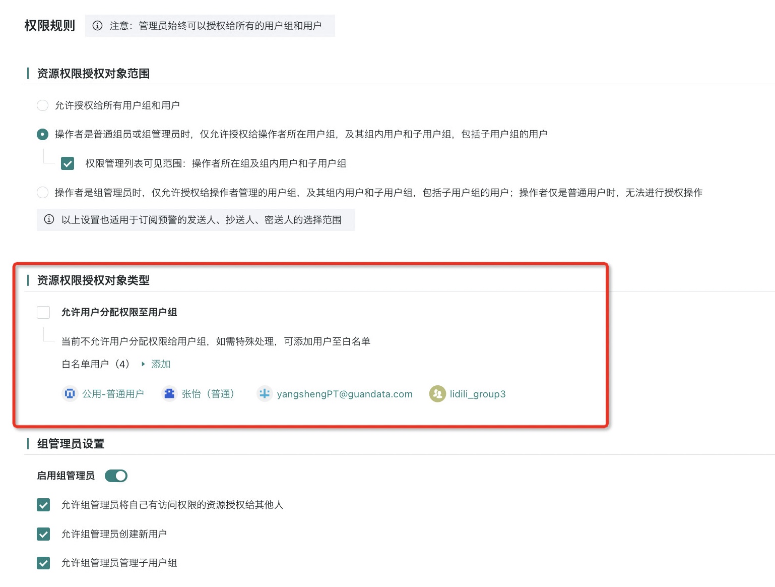 权限规则-资源权限授权对象类型中,可以选择是否允许用户分配权限至用户组。若不允许,可在白名单中添加用户做特殊处理,白名单中的用户被允许分配权限至用户组。