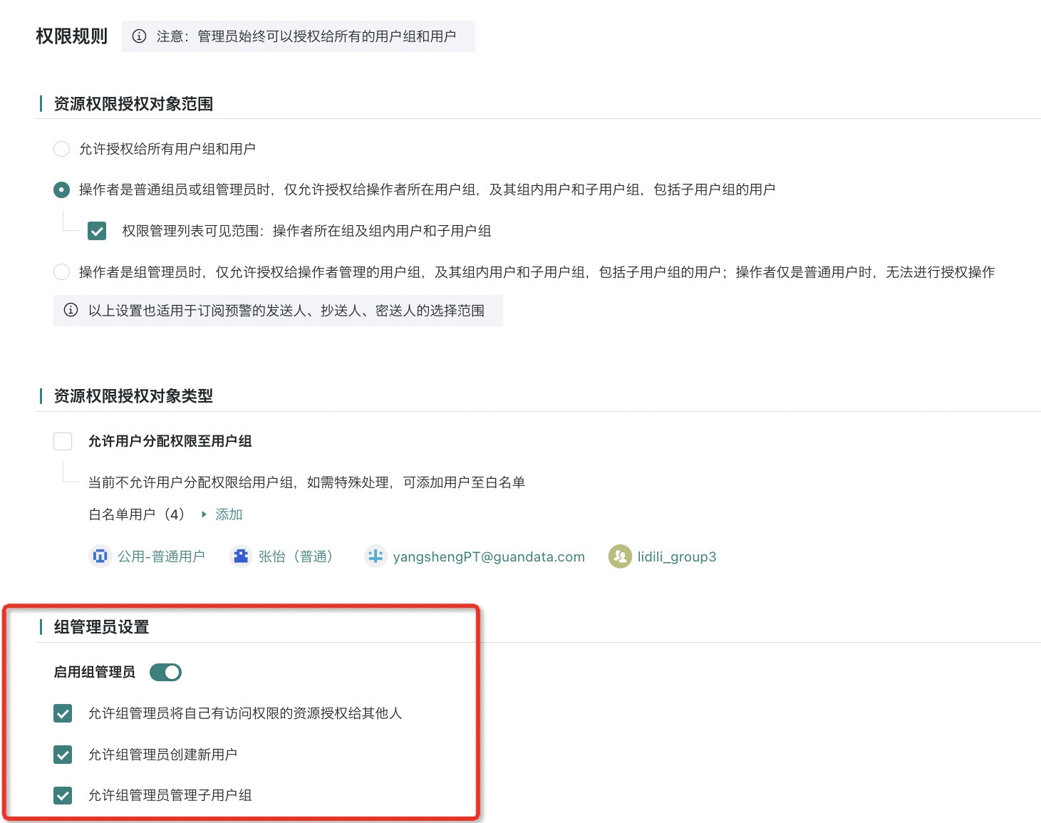 在权限规则中,管理员可以选择是否开启组管理员。若开启组管理员,可以进行以下设置: