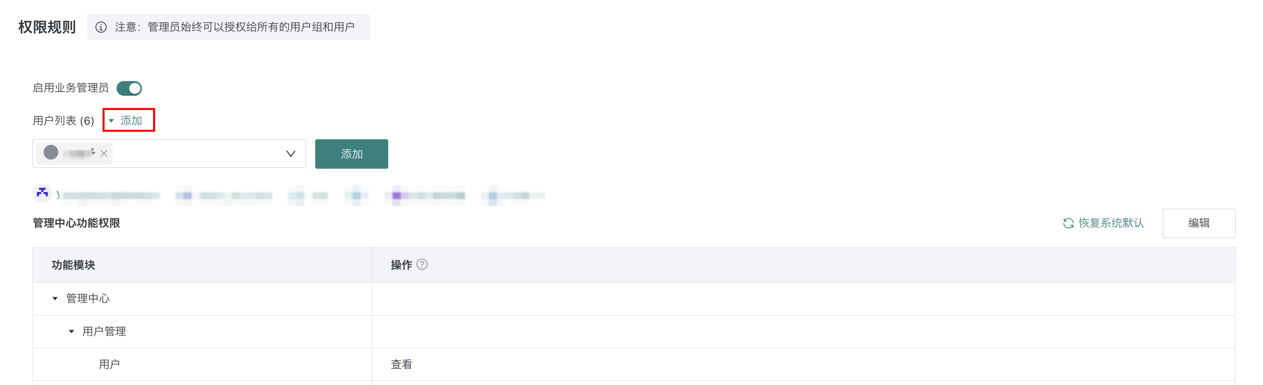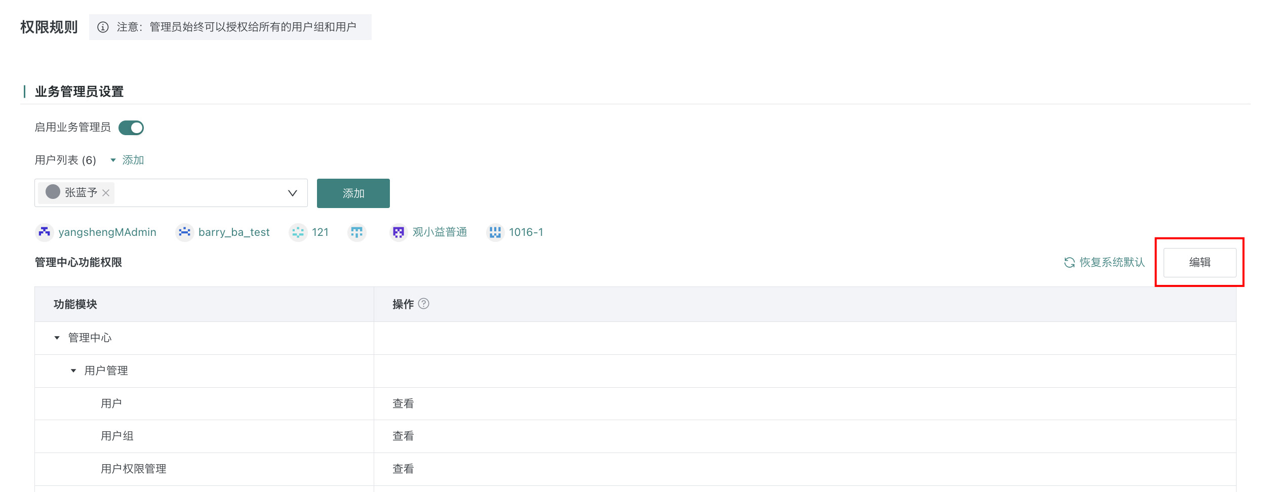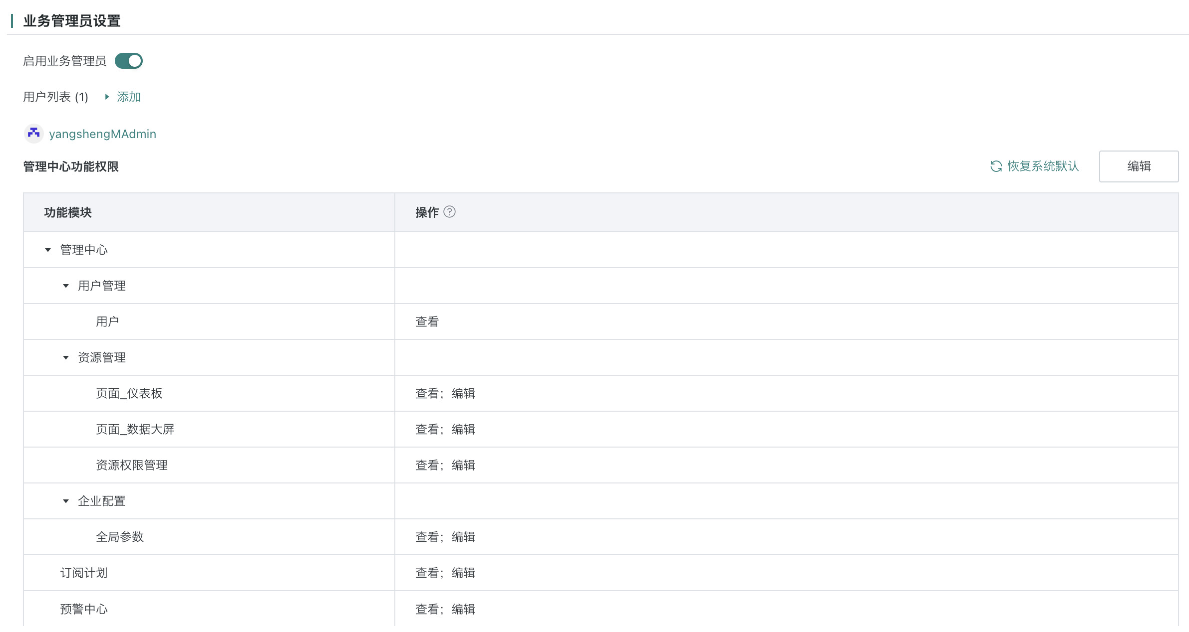 点击「编辑」,为业务管理员配置管理中心功能权限,具体可配置的权限以系统页面为准。