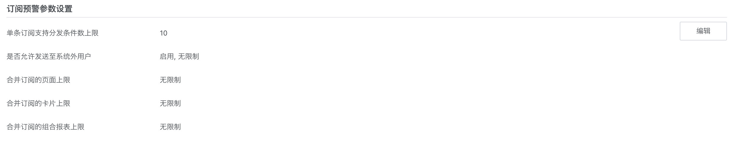 - 合并订阅的页面/卡片/组合报表上限:配置单次创建合并订阅的页面/卡片/组合报表数量,默认无限制,可修改。
