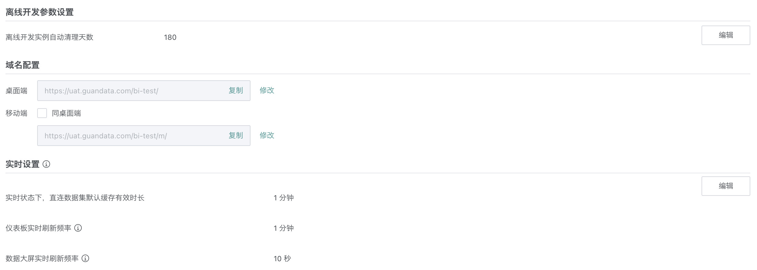 实时设置,可对实时状态下的直连数据集默认缓存有效时长、仪表板实时刷新频率、数据大屏实时刷新频率进行设置。实时状态下的直连数据集,默认缓存有效时长可进行分钟级的设置,仪表板实时状态下刷新频率与直连数据集的默认缓存有效时长一致,数据大屏实时刷新频率可进行秒级的设置。