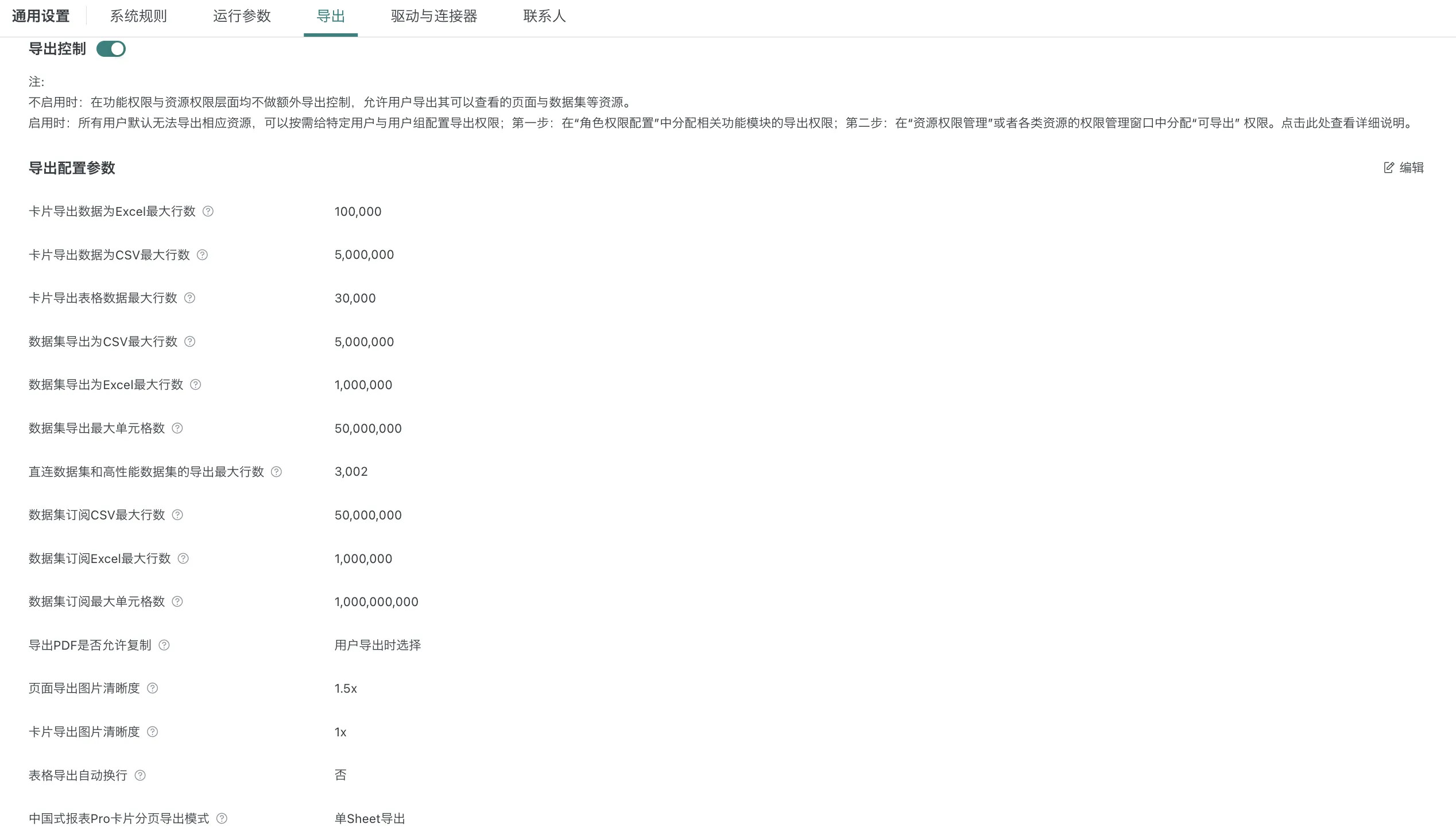 导出控制开关不启用时:在功能权限与资源权限层面均不做额外导出控制,允许用户导出其可以查看的页面与数据集等资源。
