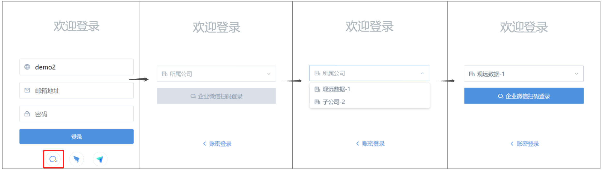 说明如果您的企业配置了多个企业微信公司的应用,则此处点击扫码登录后,需要先选择对应的子公司,得到对应子公司的二维码才能正常扫码登录。