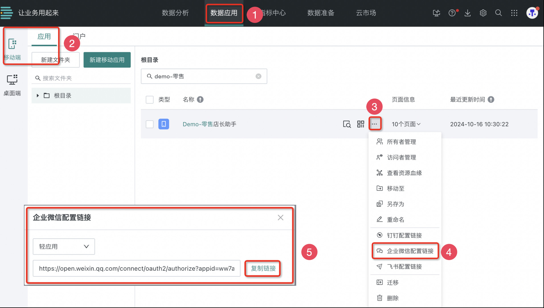 如果需要免密登录到移动端应用,可在BI界面的「数据应用 > 移动端应用 > 目标应用的管理下拉框 > 企业微信配置链接」中,快速获取移动端的应用主页地址。