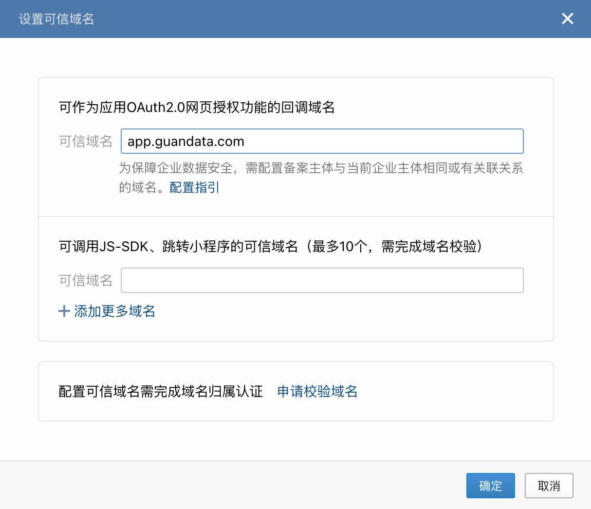 此域名需与网页授权及JS-SDK和「观远管理后台」用户属性中关联企业微信账号中的可信域名、回调域名保持三域名一致。