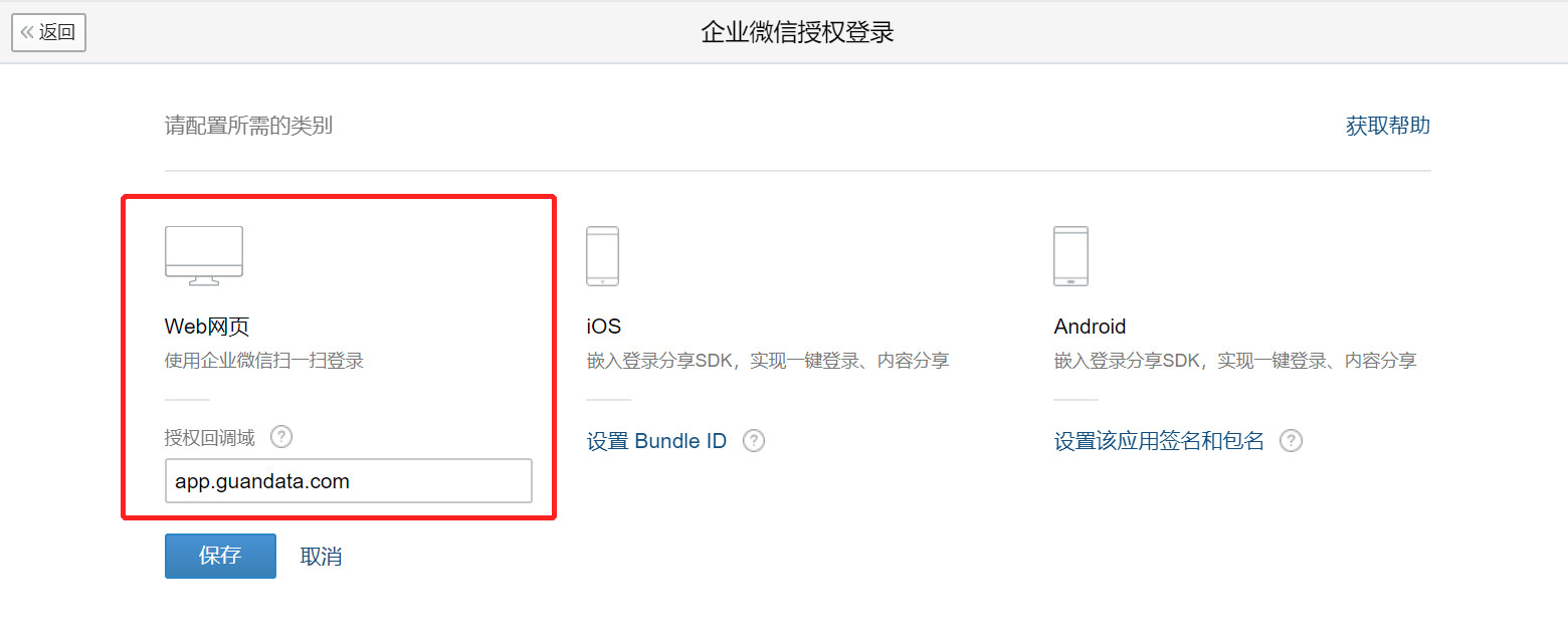 点击后,在Web网页一项中,填写回调地址。(可从观远管理后台直接获取,获取入口如2所述。)
