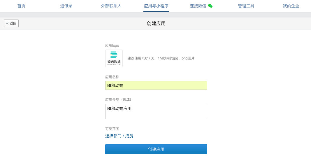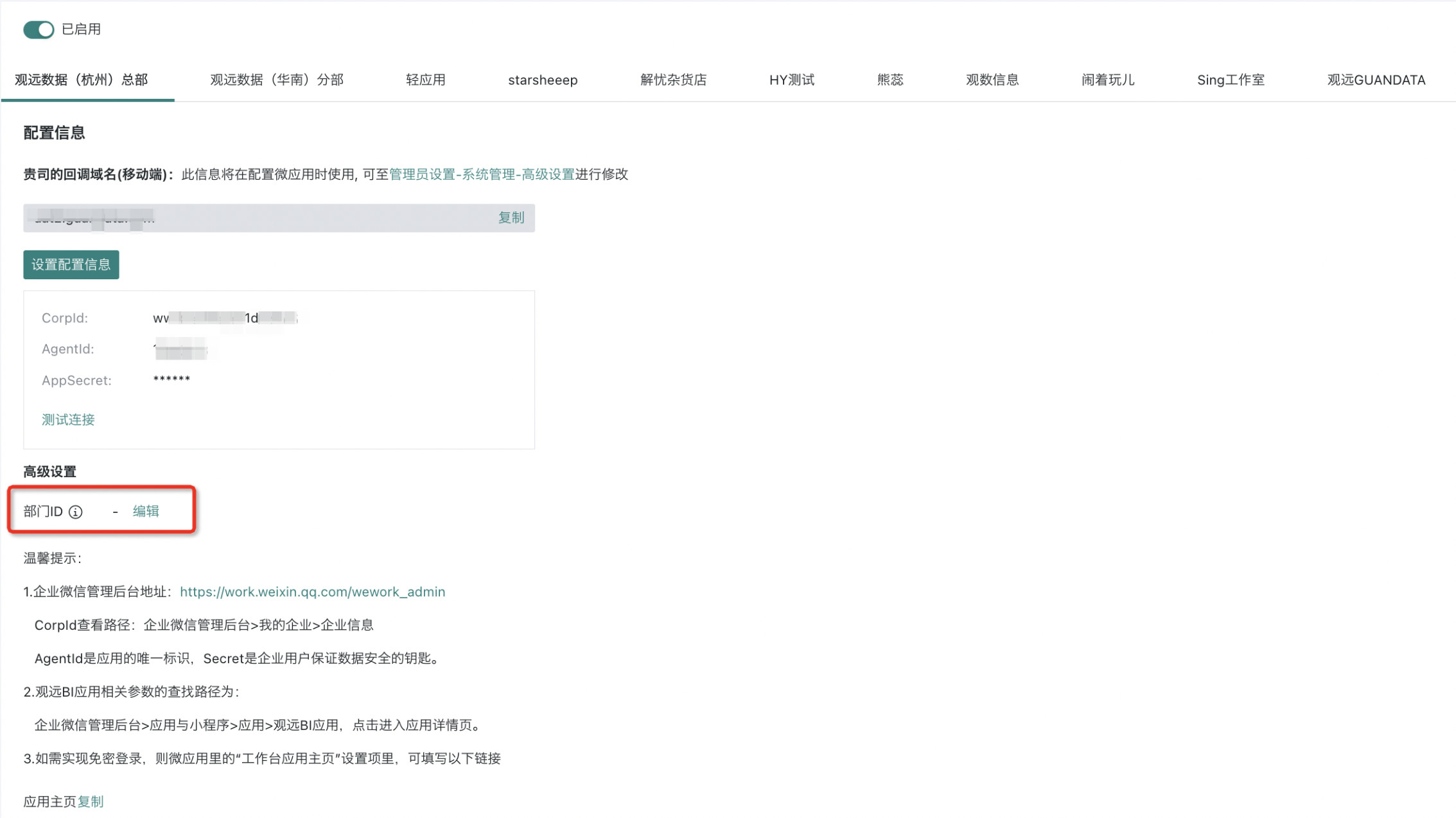 创建完毕后,可获取CorpId、AgentId和Secret,用于随后在观远管理后台进行配置。