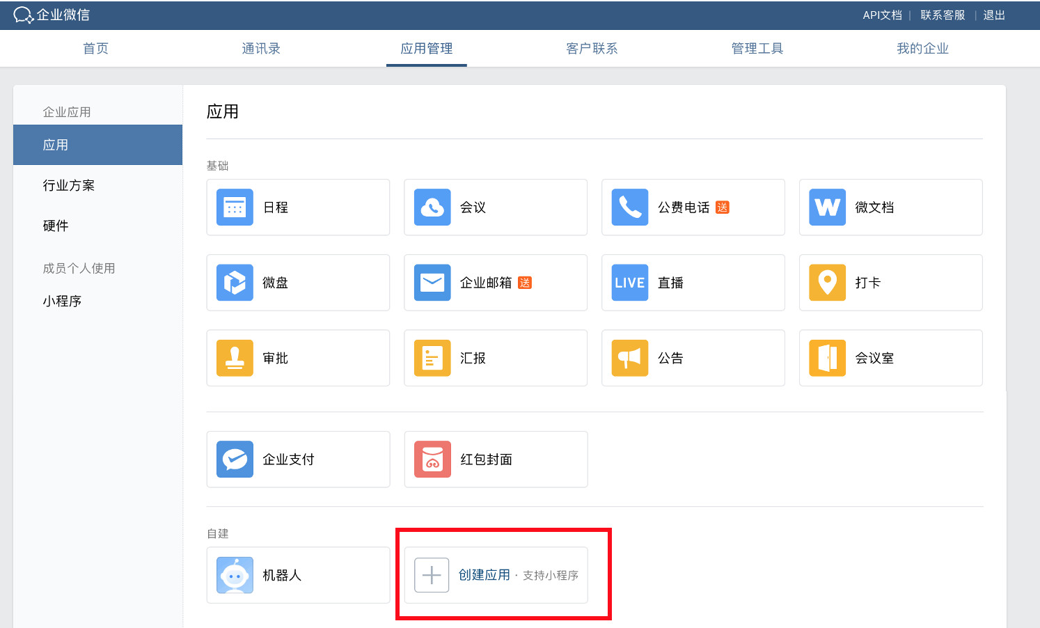 应用创建路径:企业微信PC端应用管理中心 > 应用 > 创建应用。