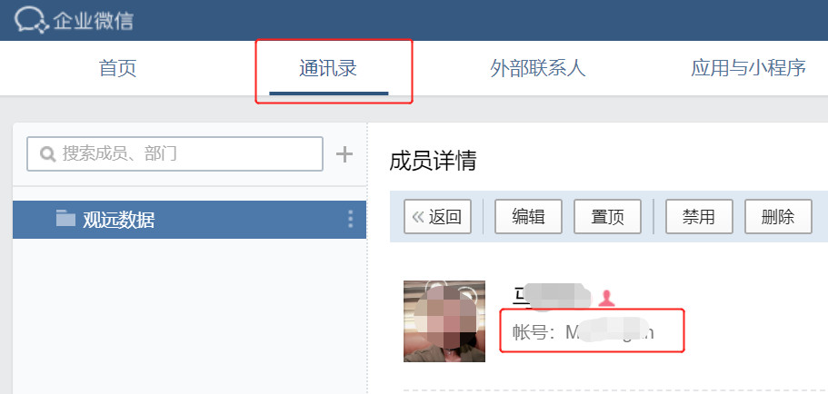 进入「企业微信管理后台 > 通讯录」,点击某个用户,查看用户的企业微信账号。