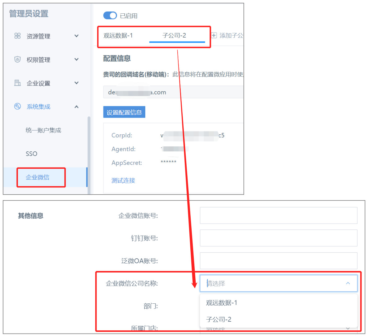配置入口:管理中心 >系统集成 > 办公OA > 企业微信。